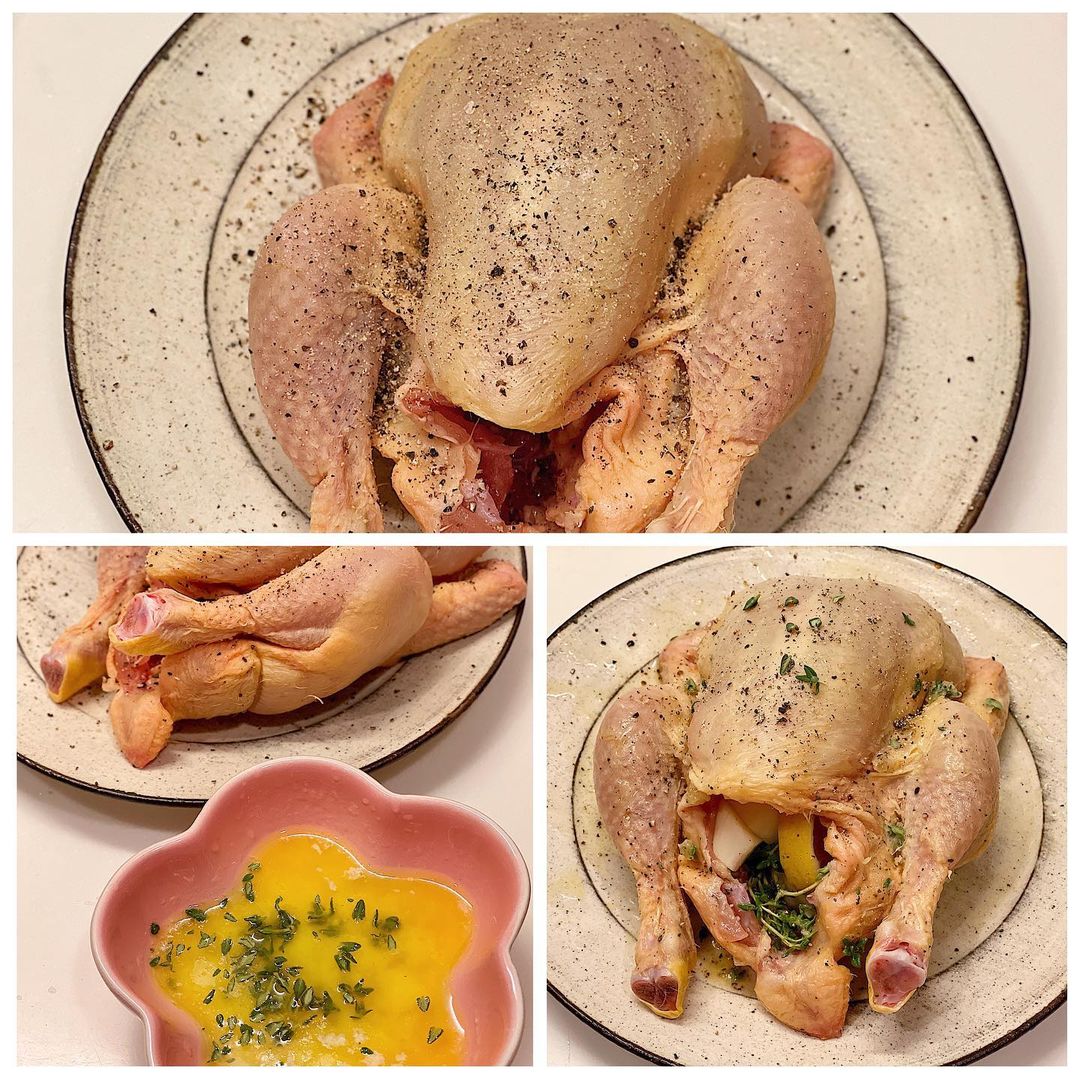2. 牛油溶液加入檸檬汁和百里香葉,均勻塗抹春雞內外。