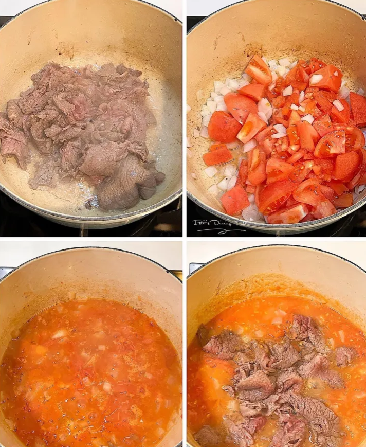 - 先盛起一部份番茄用作擺盤,其餘番茄壓蓉,加入日式醬油、味醂和百里香;下鹽、黑胡椒碎;加入麵糊中火煮至湯汁濃稠,加入和牛炒勻
