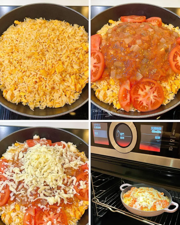 - 焗飯:炒飯鋪上豬扒,下蕃茄醬,鋪上芝士碎和蕃茄件,放入焗爐200度焗5分鐘至芝士融化,再用230度焗約8分鐘至芝士焦香即成(每個焗爐溫度不同,建議自行調節時間);可按喜好加上燶邊太陽蛋!