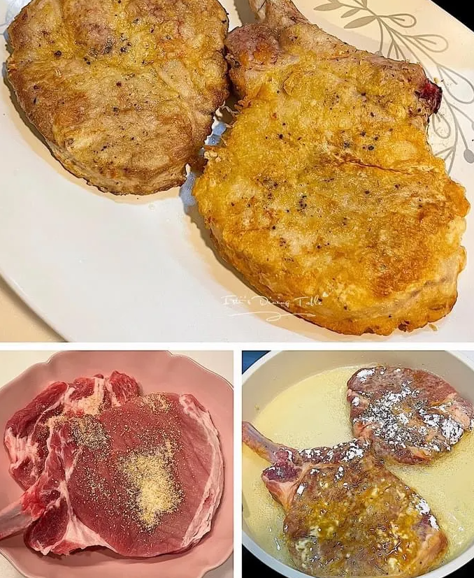- 下油開鍋,豬扒拍上粟粉,中火煎至兩邊金黃熟透,盛起備用