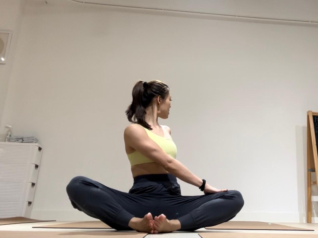 然後可以坐穩,開始做蝴蝶式扭腰,吸氣時扭腰向右邊,左手推右邊大髀,右手在背後撐着地下。吸氣時身體扭動,心口扭動想轉動多一點,呼氣的時候可以停留。此動作可以維持5至10個深長呼吸,最後吸氣回正,然後做另一邊。