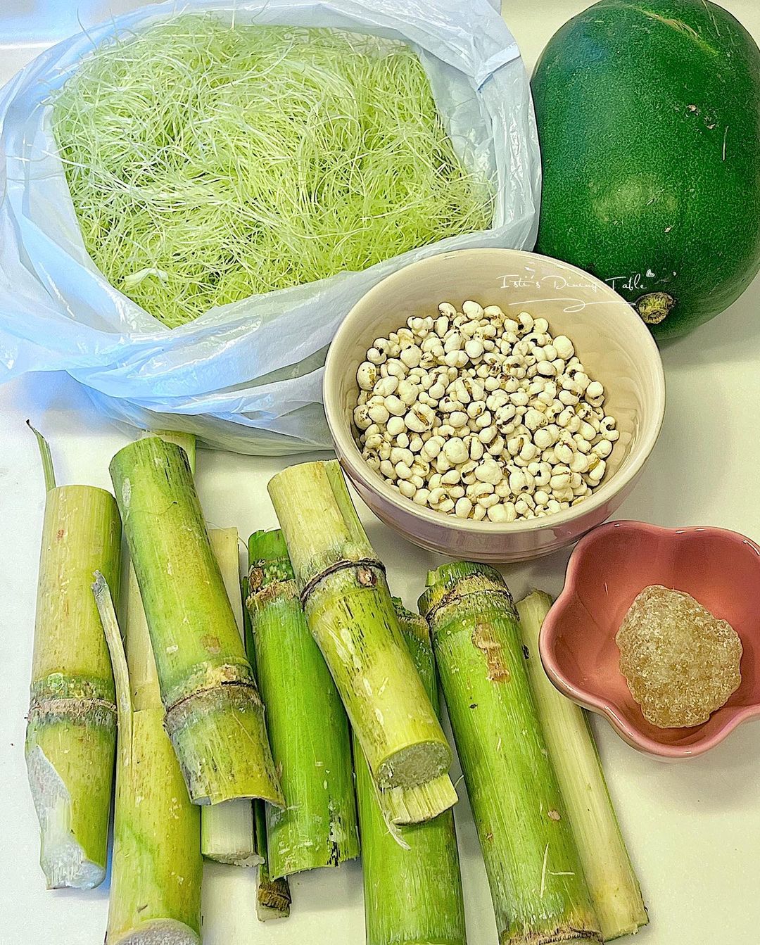 材料:竹蔗3條620g、粟米鬚300g、小冬瓜1個、生熟薏米 70g、水2500ml、冰糖 60至80g