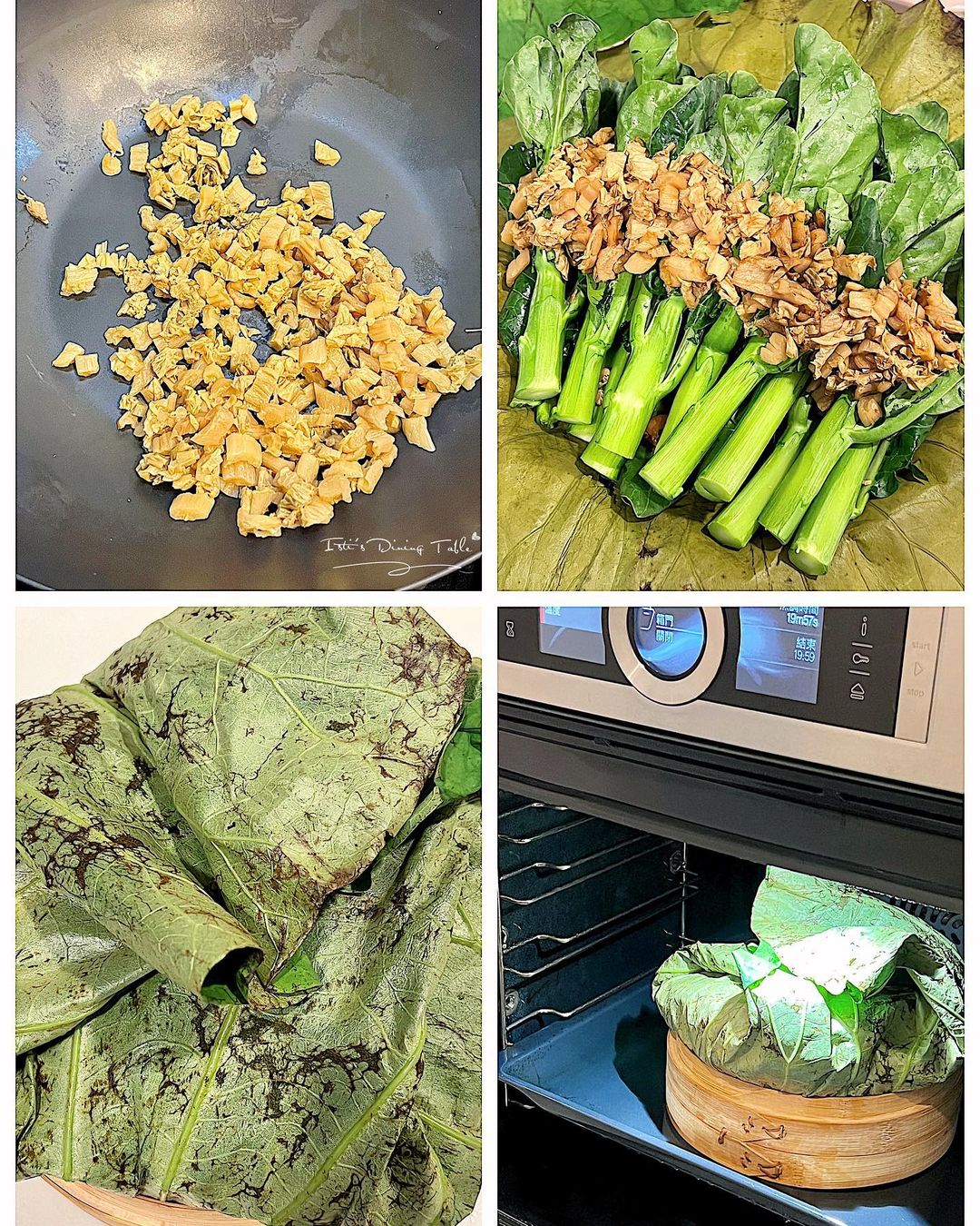 - 甜梅菜粒白鑊炒香,加入生抽和砂糖調味,放上芥蘭,用乾荷葉包好,再放上鮮荷葉包實,放上竹籠,蒸8分鐘。