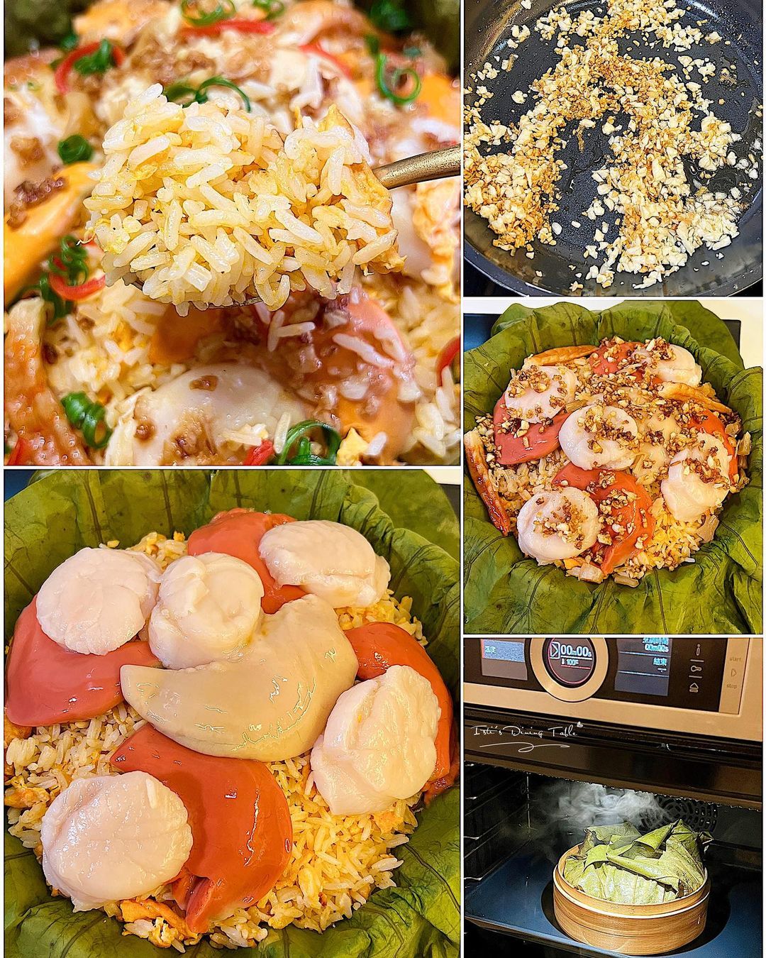 - 炒飯放上荷葉,鋪上帆立貝、金銀蒜、瑤柱和虎蝦乾;用牙籤封好荷葉,100度蒸12分鐘,灑上蔥花即成。