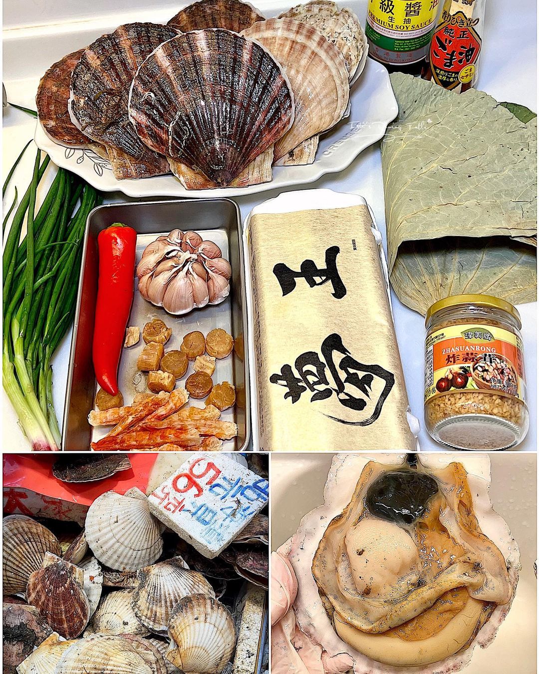 材料:帆立貝 6隻、乾荷葉1塊、泰國金鳳米 1.5米杯、雞蛋 3隻、蔥1棵切粒、瑤柱/虎蝦乾(熱水浸軟或可省略)