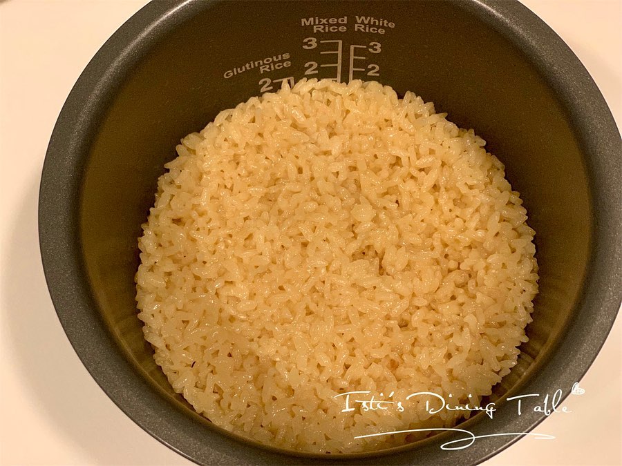 - 用浸菇水煮熟米飯,放入雪櫃備用。(此方法能令米飯充滿菇味)