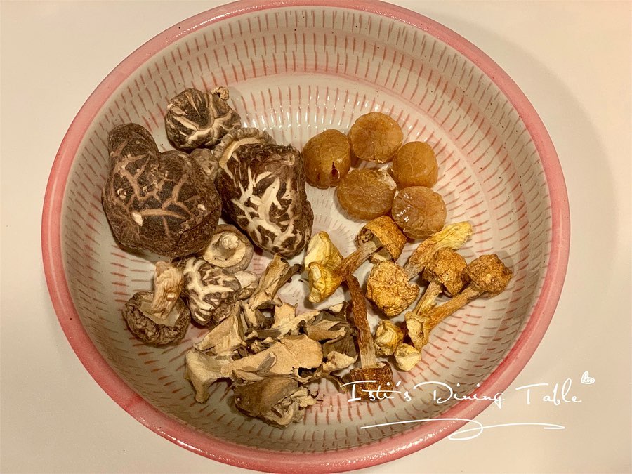 - 菇類用生粉洗淨,加入開水放入雪櫃浸發至少3小時。