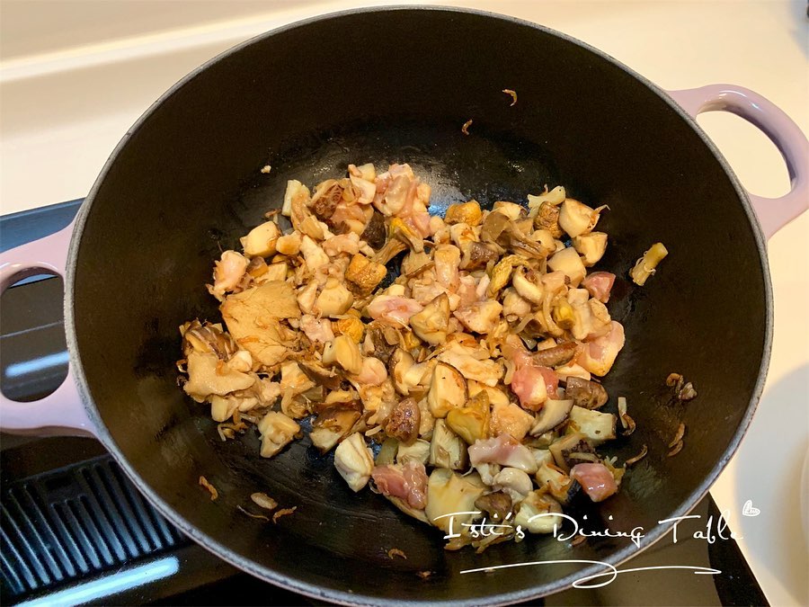 - 蒜頭、紅蔥頭切碎,所有菇類切粒。