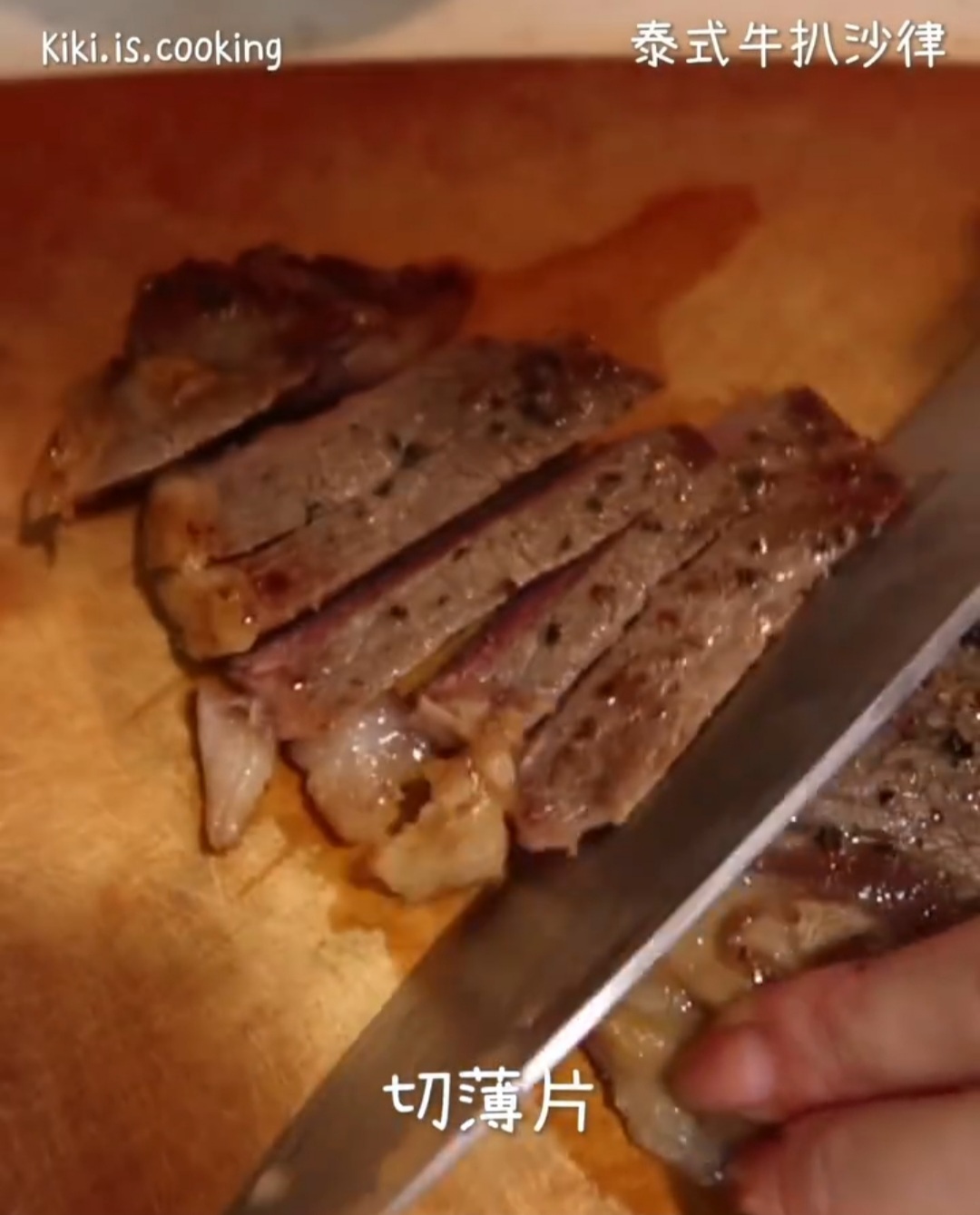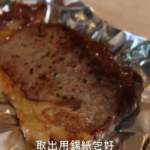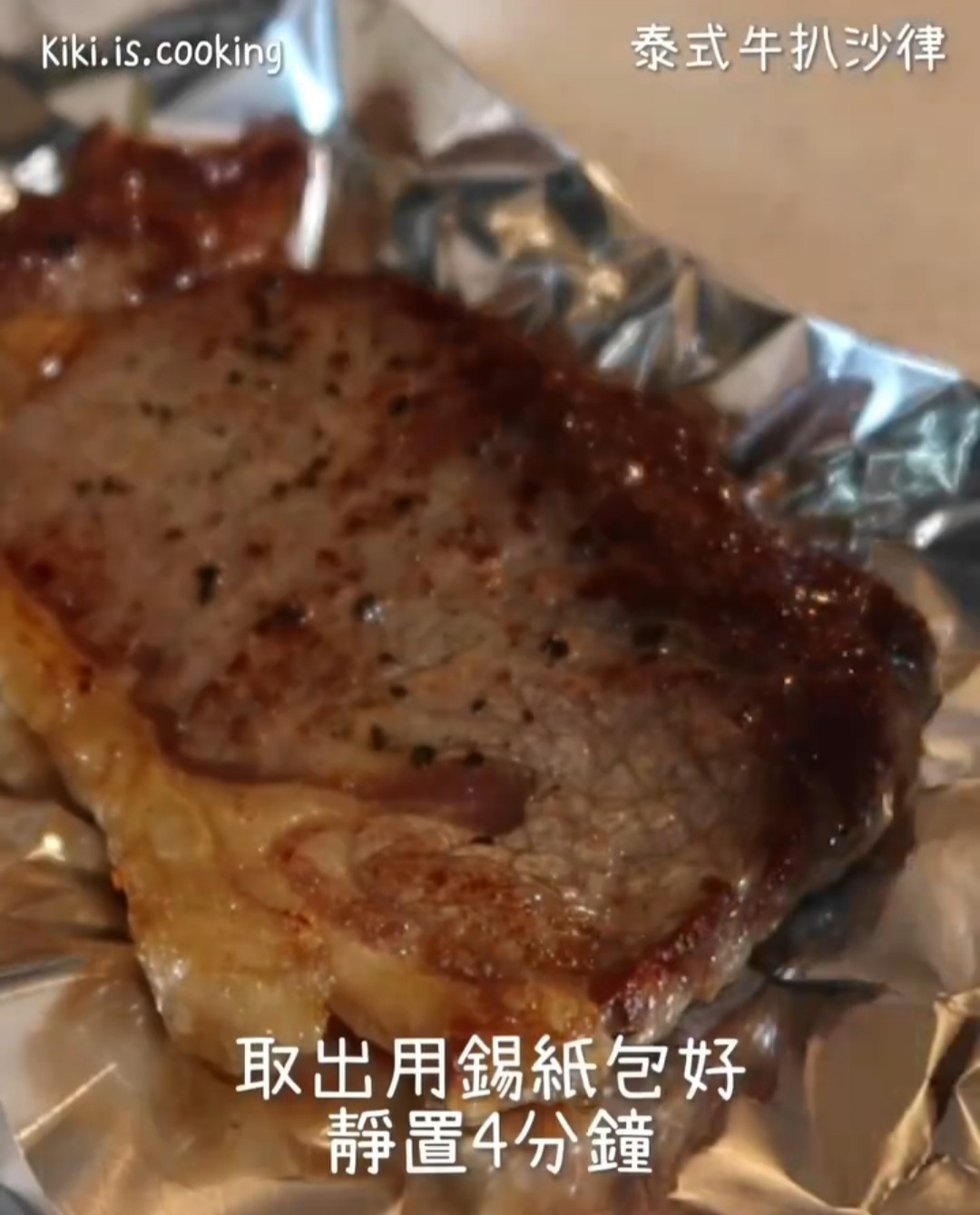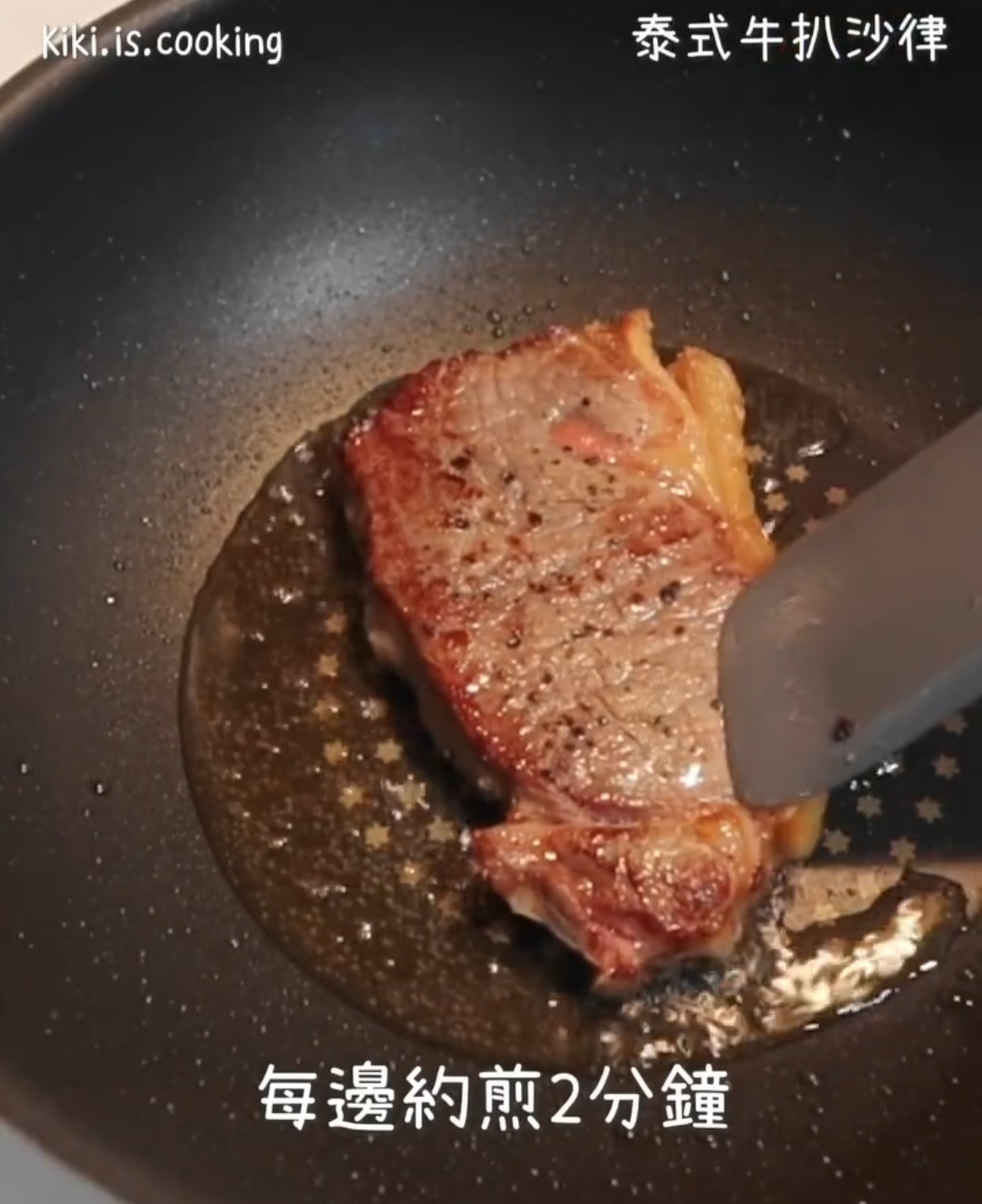 - 燒熱 2 湯匙油,大火煎牛扒 2分鐘,翻面再煎 2 分鐘(實際時間按牛扒大小而定),取出牛扒用錫紙包好,靜置 4 分鐘,然後切片。