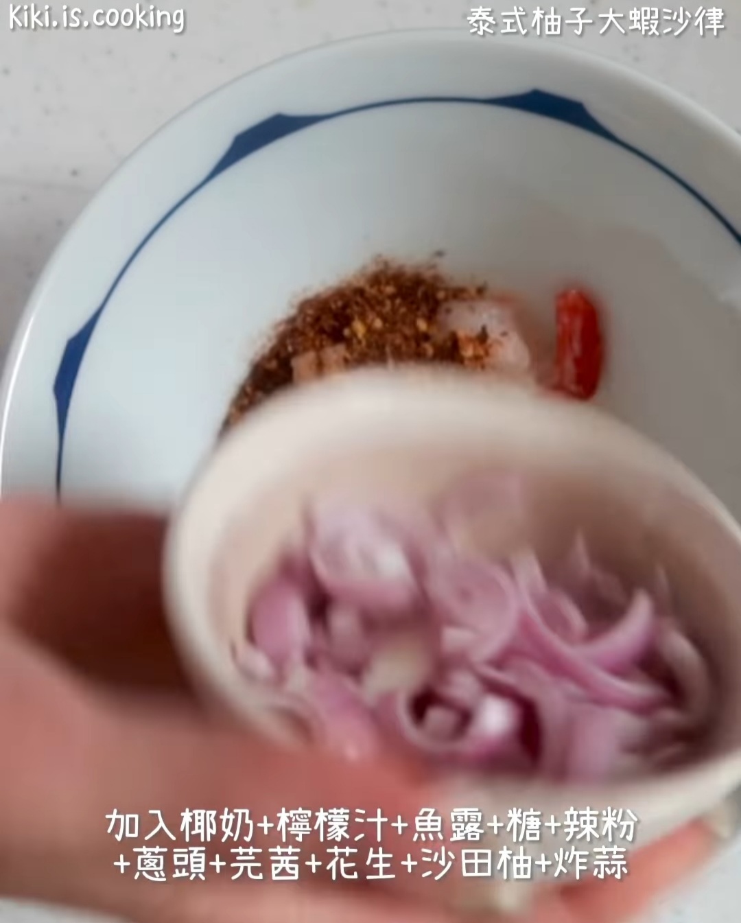 - 柚子拆出 200g 肉;蝦仁開背,放入熱水烚 2分鐘,取出浸涼水;蔥頭切碎。