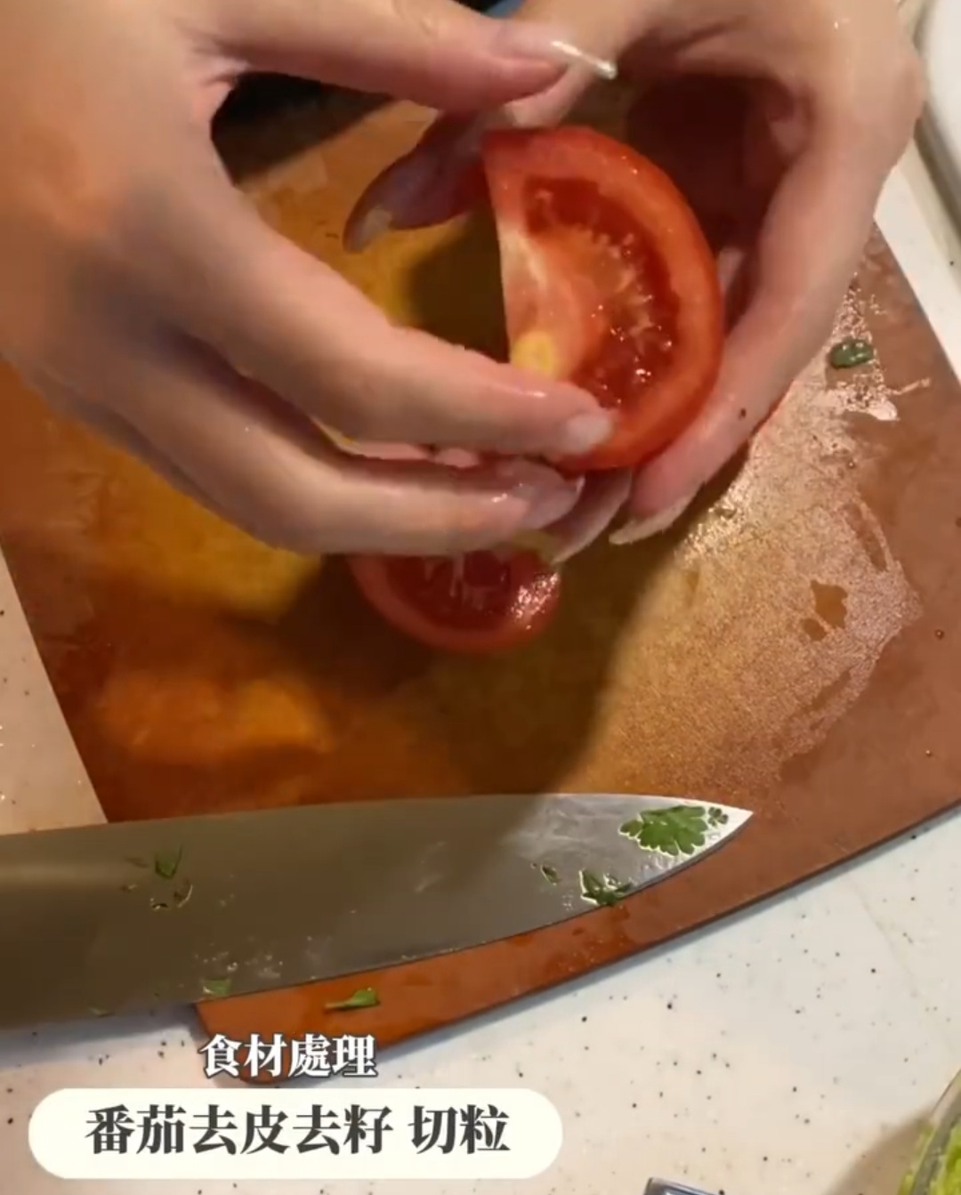 - 牛油果取出果肉,壓成蓉;洋蔥切粒;番茄去皮去籽,切粒;芫茜取葉,切碎;蒜頭切成蓉。