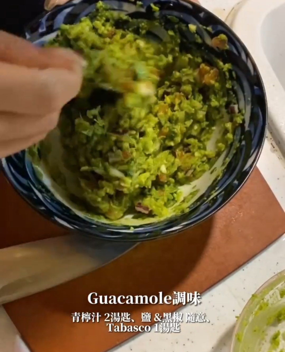 材料:Tortillas4至5片、牛油果 2個、洋蔥 1/4個、番茄1個、芫茜 3棵、蒜頭 4粒、Tabasco、青檸汁