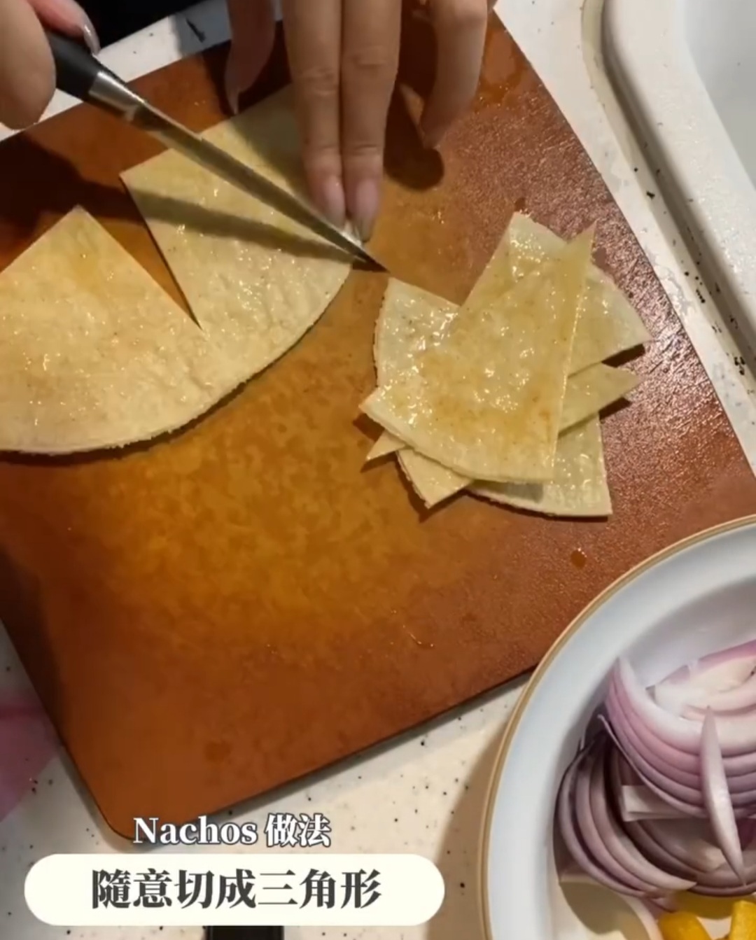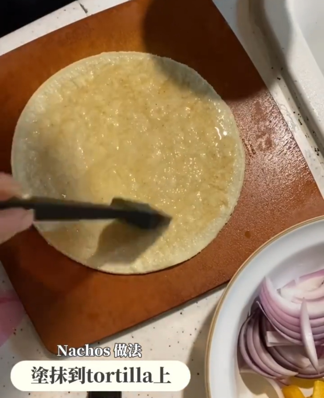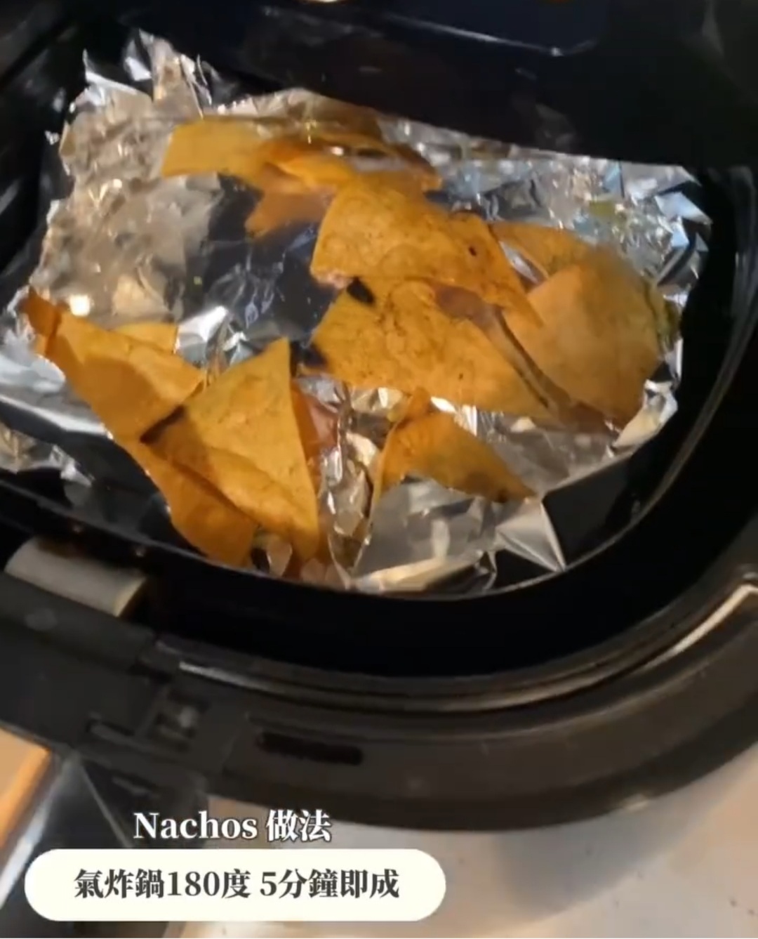 - 拌好的橄欖油塗抹在tortilla 上,切成三角形,直接放入氣炸鍋 180度焗5分鐘,完成。