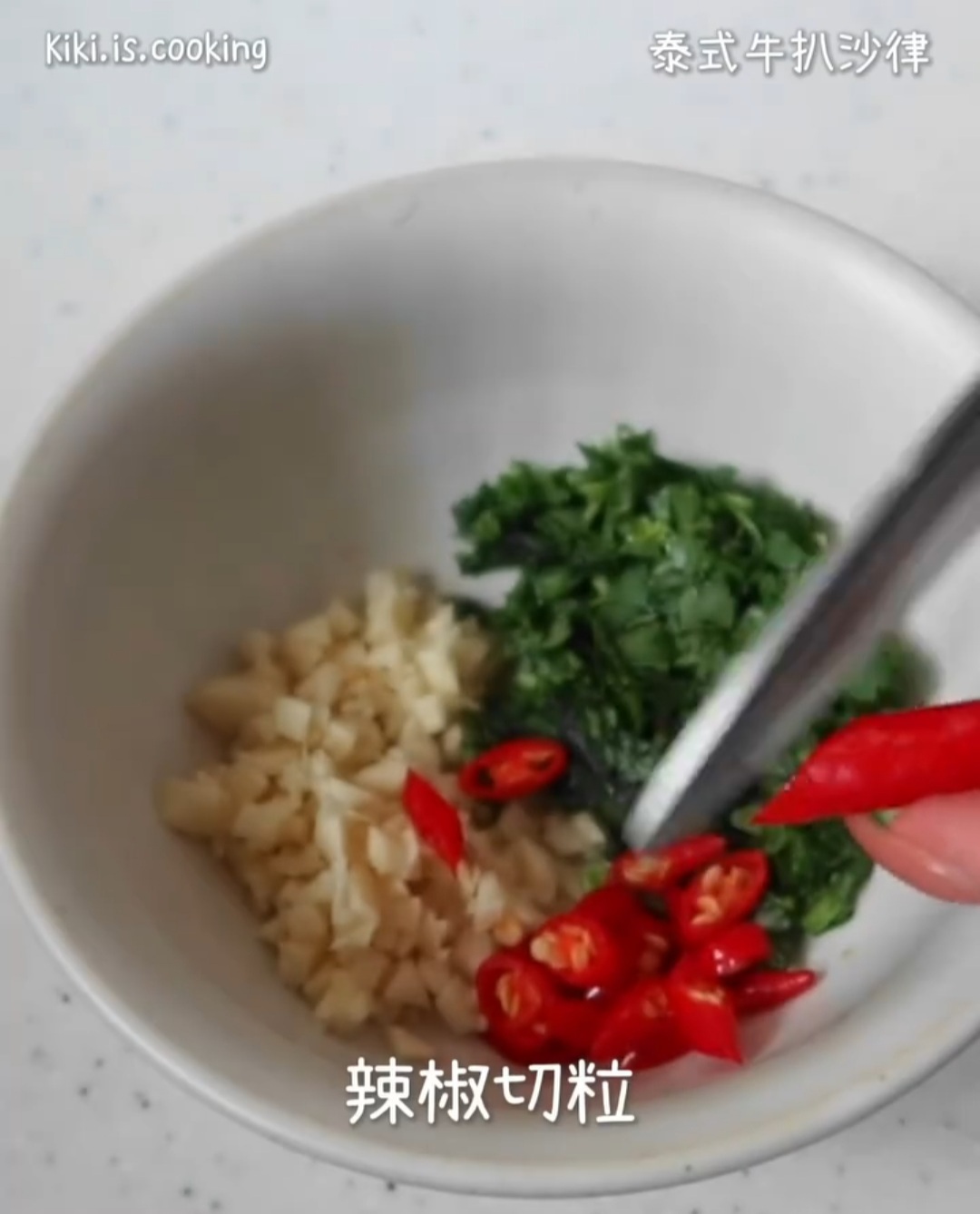 - 指天椒切粒;蒜頭、芫茜切碎;與其他調味料混合待用。