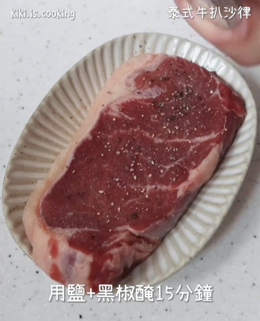 - 洋蔥切絲;青瓜去囊切片;車厘茄切塊;芫茜、薄荷取葉;牛扒印乾用鹽黑椒醃15分鐘。