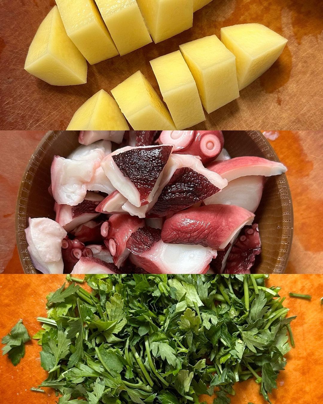 - 燒熱一鍋滾水,加入2茶匙鹽,烚薯仔至喜歡的熟度(大約 10分鐘,視乎大小);然後再灼章魚1分鐘。