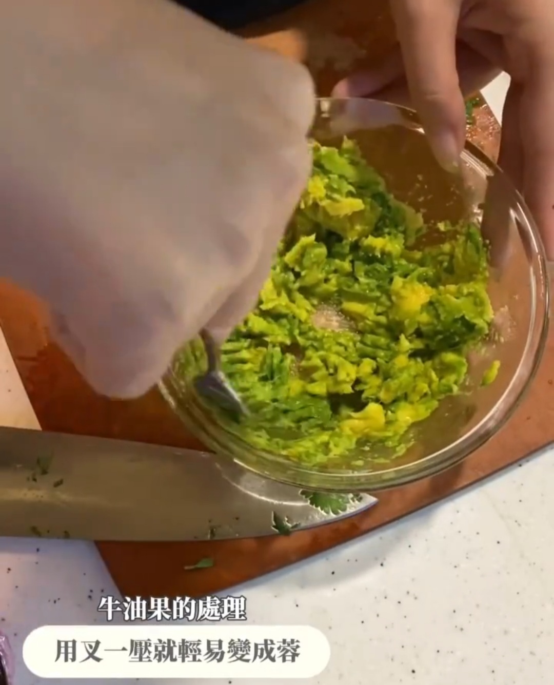 - 牛油果取出果肉,壓成蓉;洋蔥切粒;番茄去皮去籽,切粒;芫茜取葉,切碎;蒜頭切成蓉。