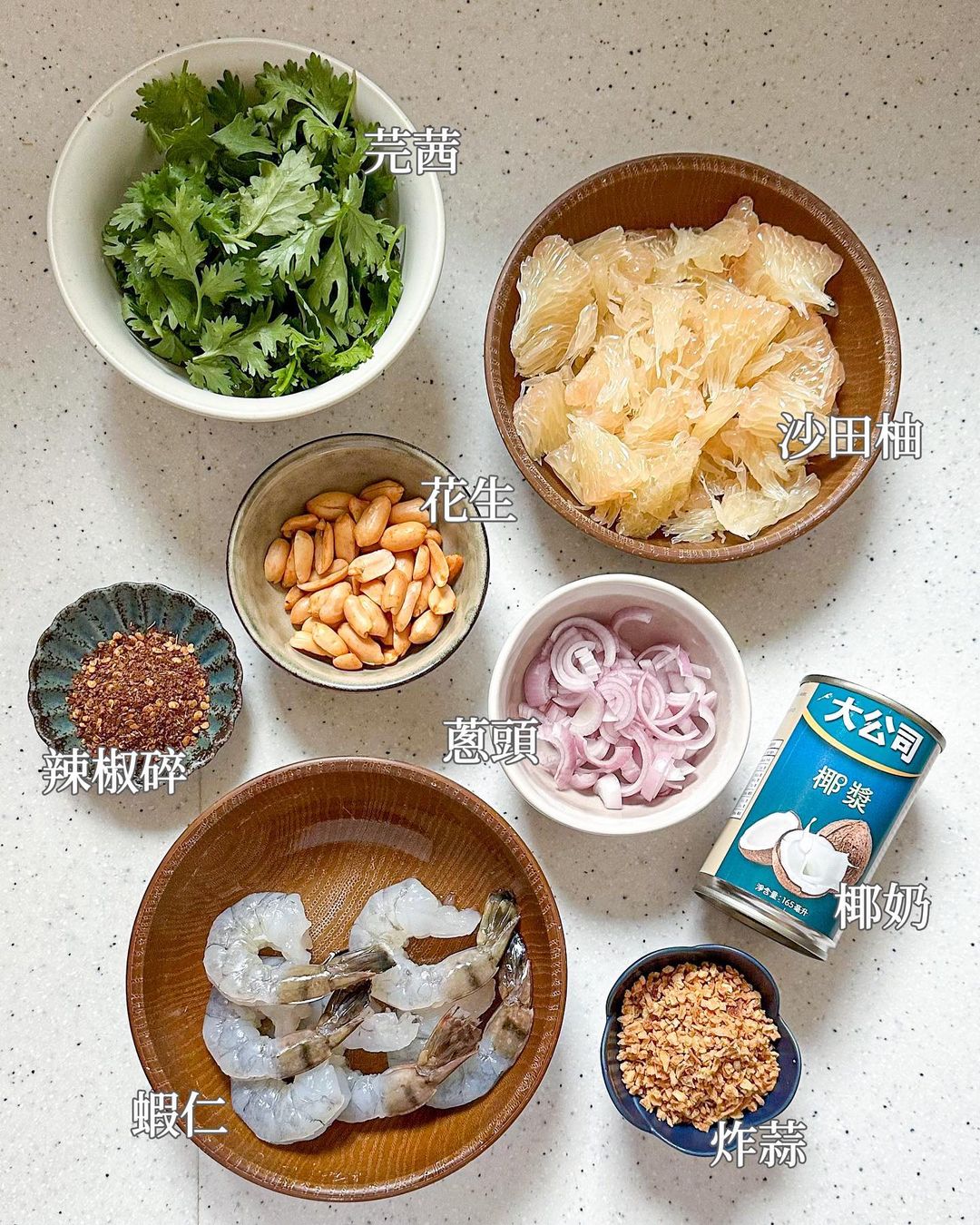 材料:沙田柚(肉) 200g、蝦仁 6隻、鹽烤花生 2湯匙、蔥頭 2粒、炸蒜 1湯匙