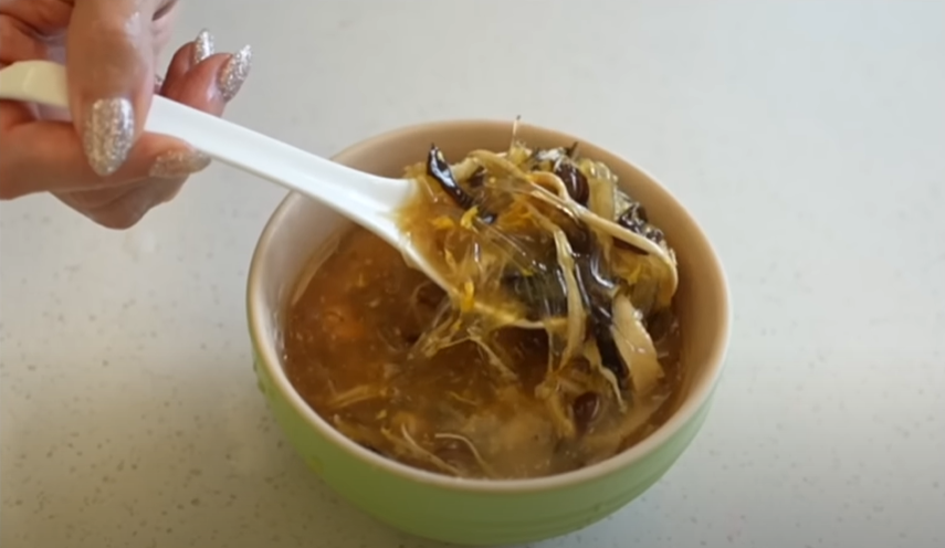 仿魚翅、冬菇、木耳、乾瑤柱、雞胸、薑、蔥頭、馬蹄粉、雞湯