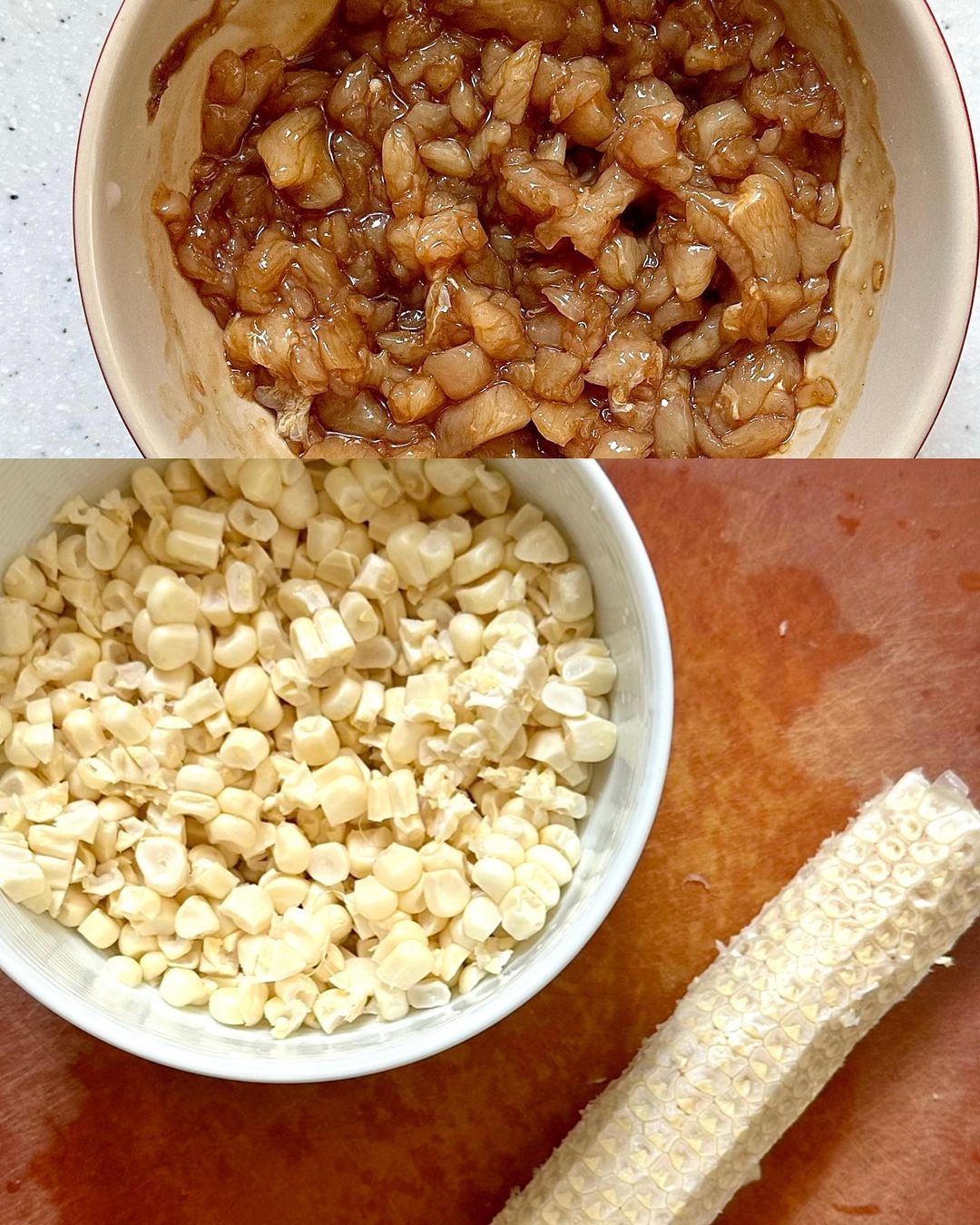 - 魚肚浸熱水至軟身,切粒;雞柳切碎,用醃料醃 20 分鐘;雞蛋發好;粟米切出粟米粒