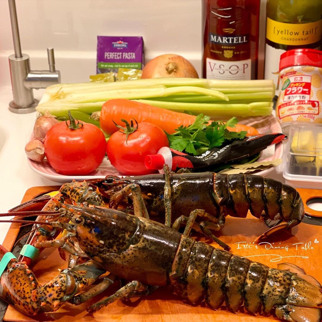 材料(2人份):波士頓龍蝦2隻、水/蔬菜高湯700ml、甘荀100g切粒、西芹60g切粒、蕃茄1個切件、洋蔥半個切粒、乾蔥/紅蔥頭1個切粒、蒜頭1瓣切粒、蕃茜莖(Parsley) 3棵、干邑白蘭地60ml、白酒20ml