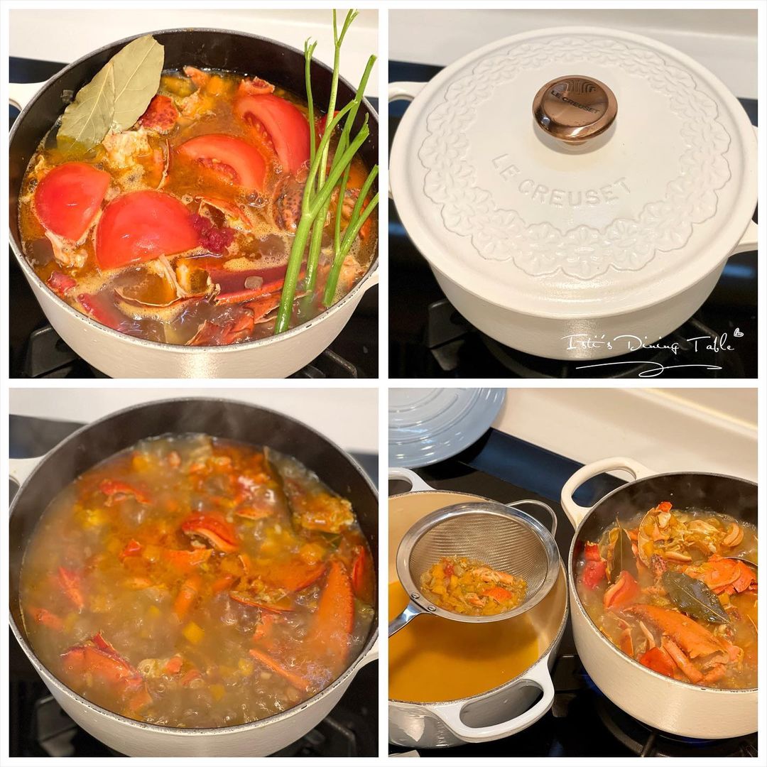 - 加入水/高湯、蕃茄、月桂葉、蕃茜莖和茄膏,中火煮沸後合蓋小火煮1小時,過篩後小火翻熱,加入步驟3的龍蝦肉煮5分鐘。