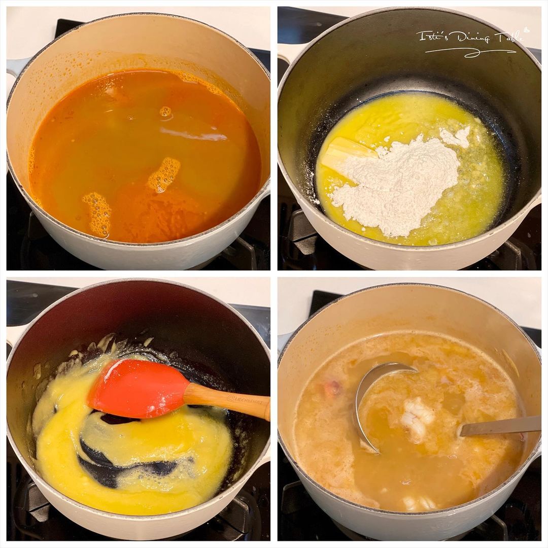 - 將麵糊慢慢加入至步驟7的龍蝦湯,小火攪拌至理想濃稠度。