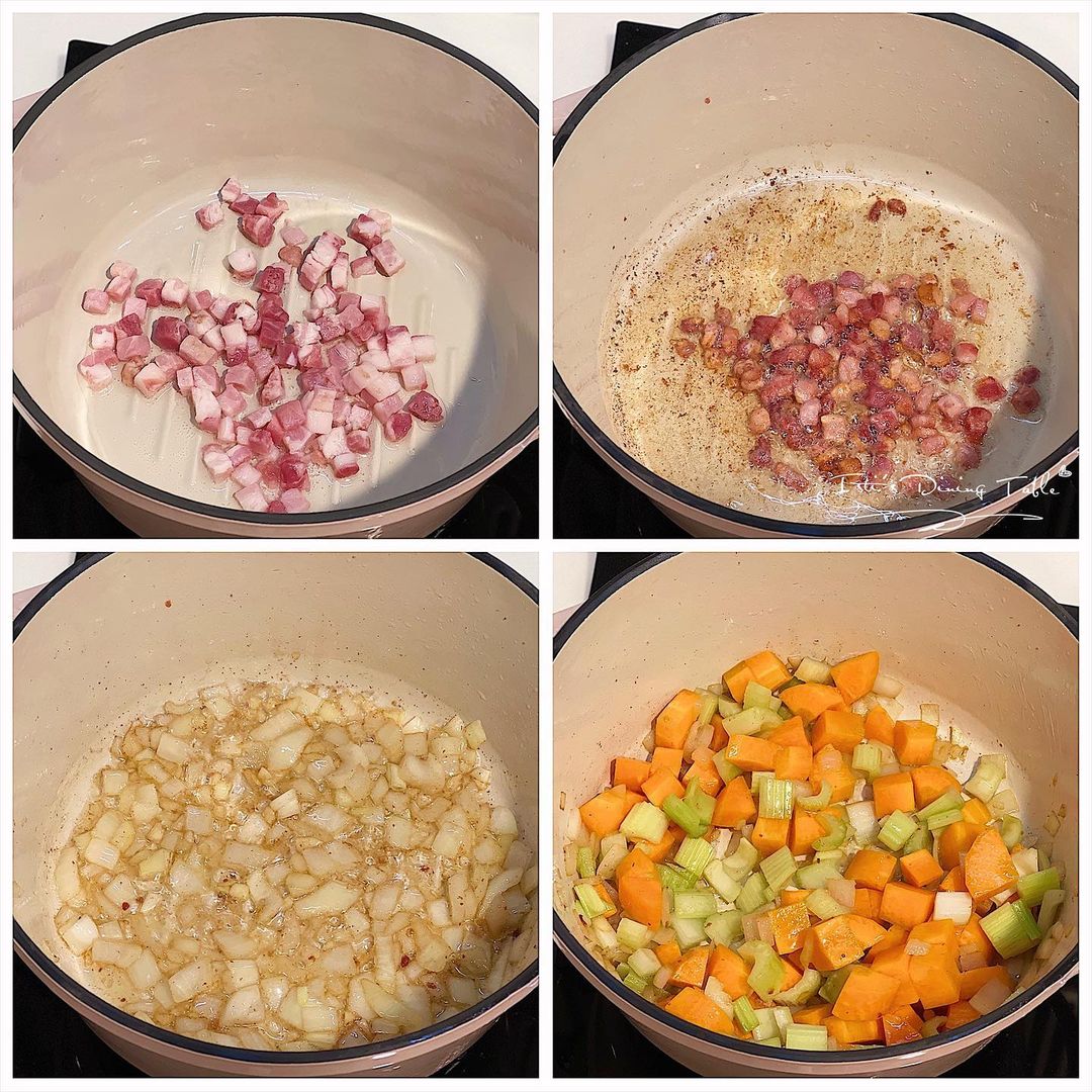 - 湯鍋抹油,加入煙肉粒,小火煎至乾透脆身後盛起。