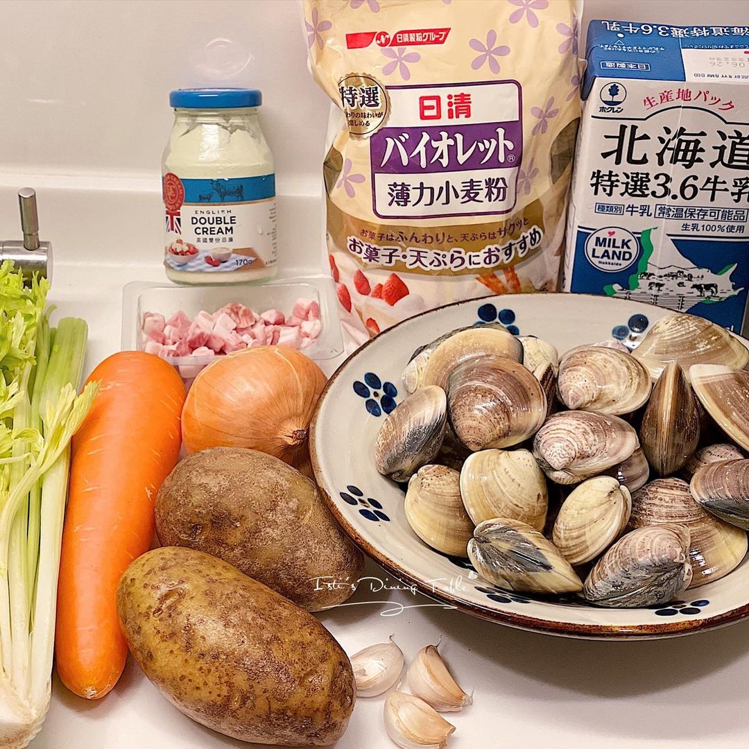 材料:沙白/蜆 1.5kg (=2.5斤)、煙肉粒 70g、甘筍 1條、西芹 1/4棵切粒、焗薯 1-2個、洋蔥 半個切粒、蒜頭 3瓣切粒、水 300ml、白酒 50ml、魚湯/ 現成魚高湯 200ml、鮮奶 200ml、鮮忌廉(Double cream/ cooking cream) 50ml