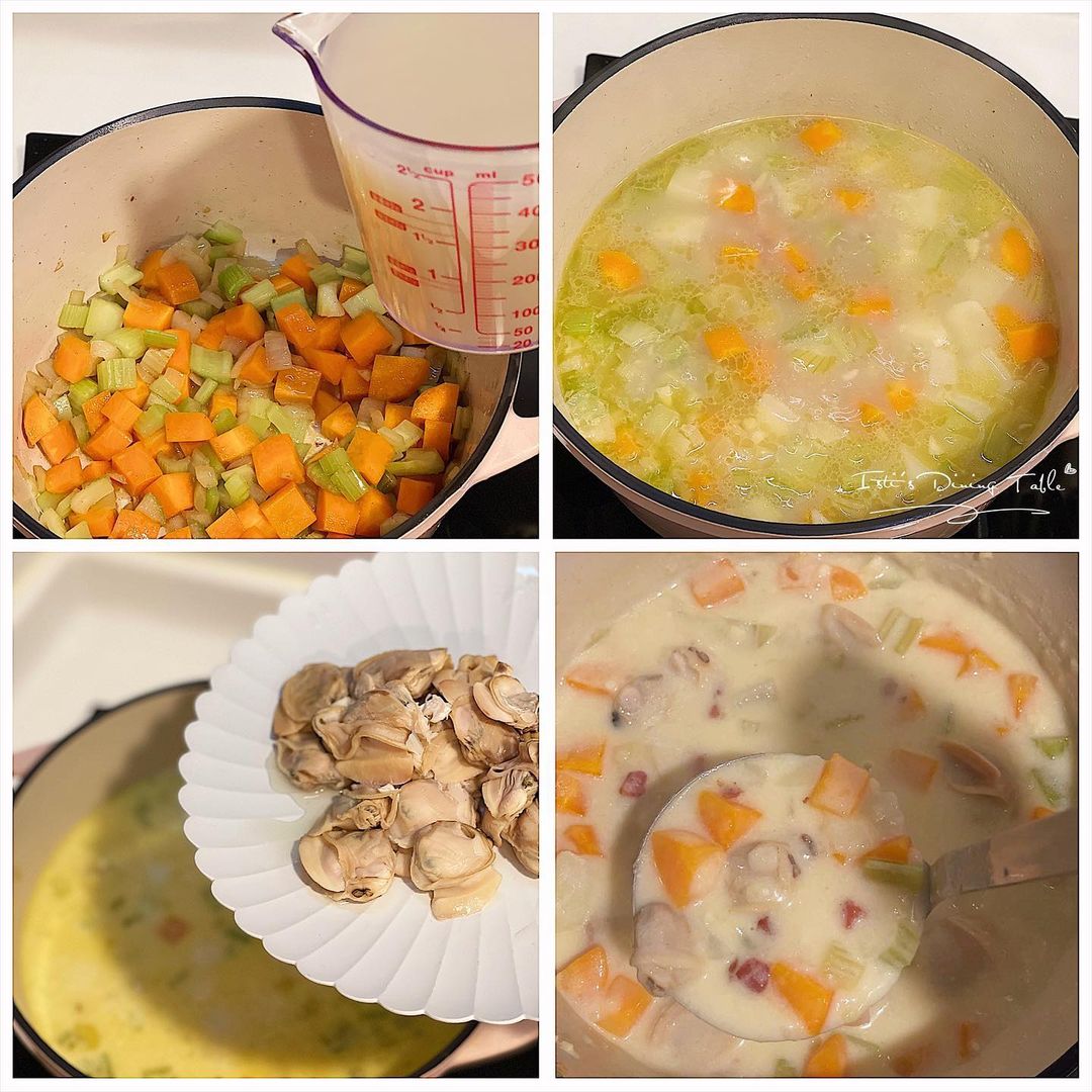 - 同一個鍋加入洋蔥粒和蒜粒,炒香後加入西芹和甘荀粒拌炒,然後加入蜆汁和魚湯,煮滾後放入焗薯,合蓋小火煮30分鐘,然後加入鮮奶和鮮忌廉,下鹽、黑胡椒調味。