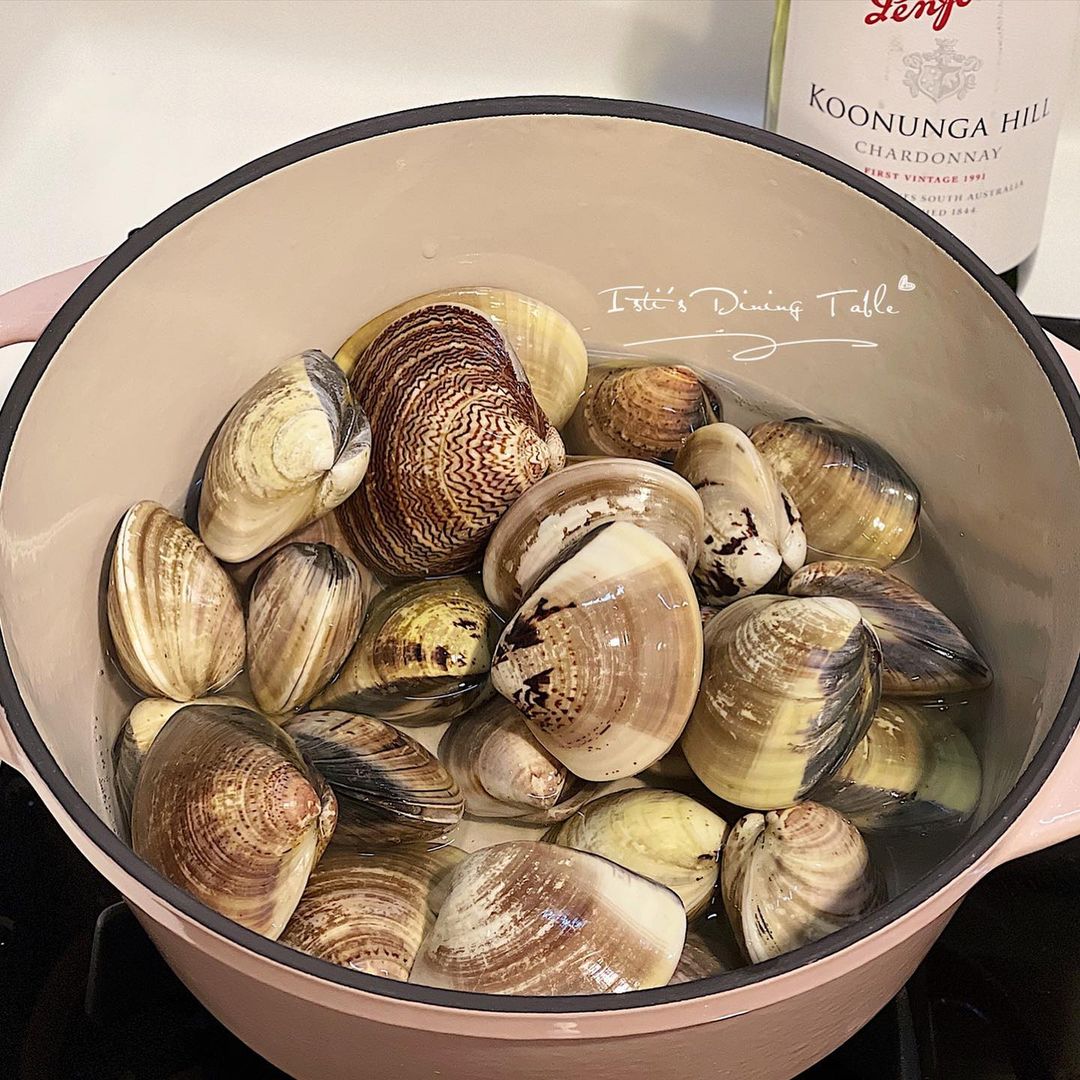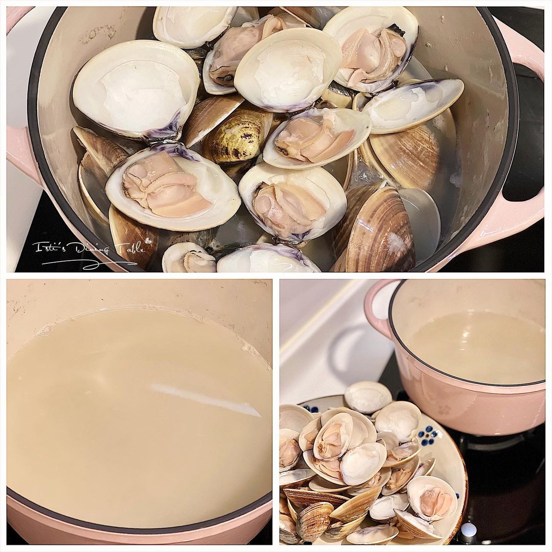 - 大鍋加入白酒,大火煮滾2分鐘至酒精揮發,再加入水煮滾,放入蜆,開口後馬上撈起避免過熟,蜆汁過篩備用(約500ml)。