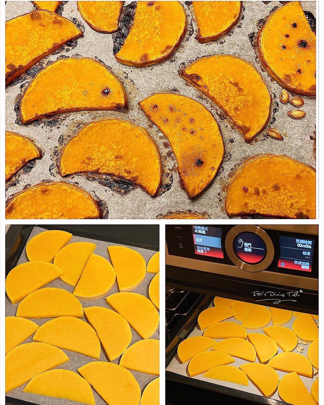 - 奶油南瓜切片,鋪平放入焗爐,180度焗45分鐘。
