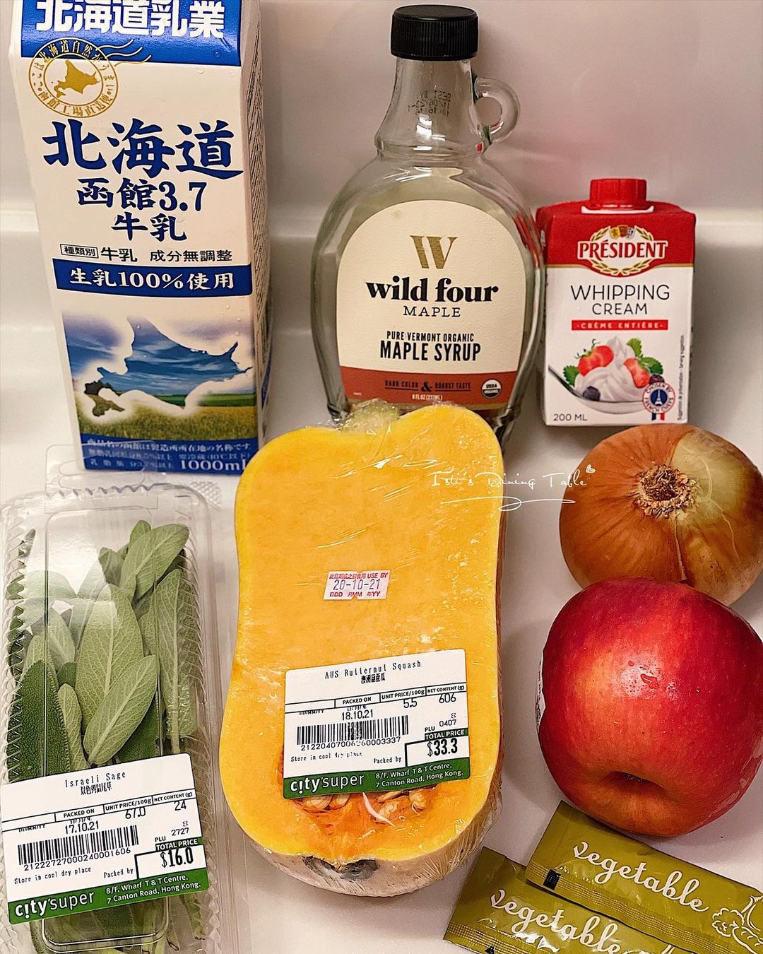 - 加入楓糖、牛奶和淡忌廉,下鹽、黑胡椒碎調味即成。