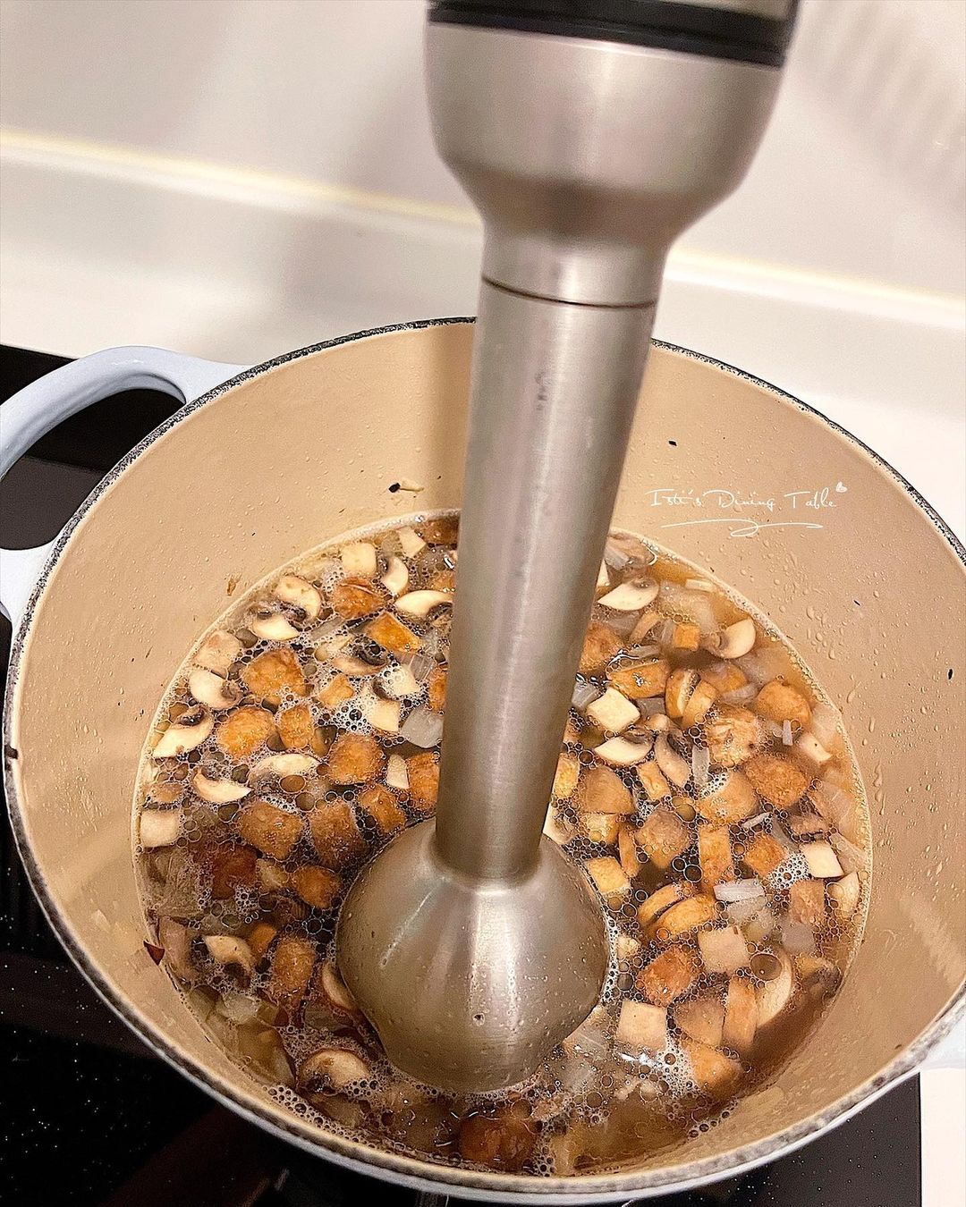 - 取出香葉,用手提攪拌棒攪勻湯至順滑;加入鮮奶和淡忌廉,中火煮至濃稠。