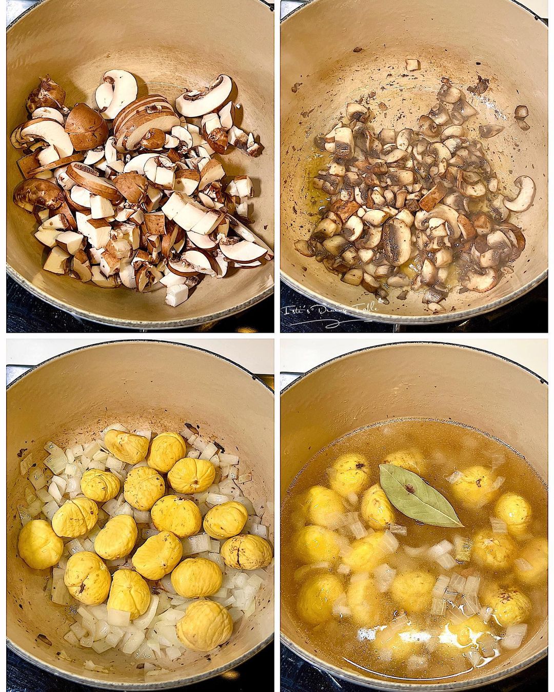 - 同一個鍋下橄欖油炒香洋蔥,加入栗子,倒入白酒;下雞湯和香葉,煮沸後合蓋小火煮30分鐘。