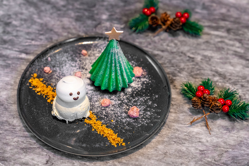 菜式:法式凍肉、M9和牛二重奏/香煎海鱸魚、Tick Tack Tick Tack朱古力時鐘造型甜品,配合一連串節日美食