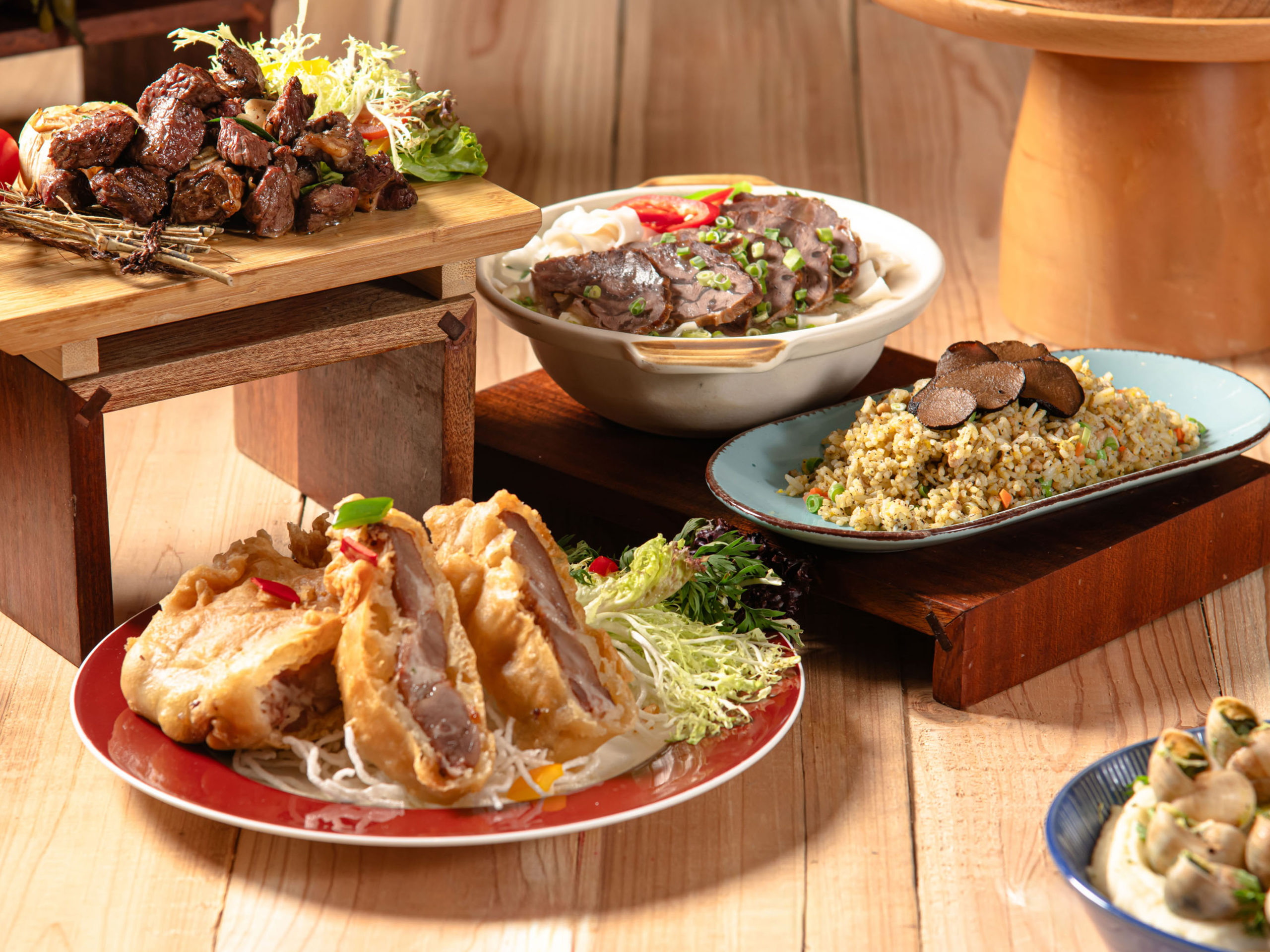 菜式:香煎蒜片和牛粒、酥炸和牛肋條、黑松露和牛菘炒飯、和牛金錢展刀削麵配越式湯等,以及加拿大鱈蟹腳、波士頓龍蝦和、燒美國有骨肉眼、慢煮鴨胸、紅莓櫻桃蛋糕、柚子芒果奶凍、繽紛鮮雜果撻等
