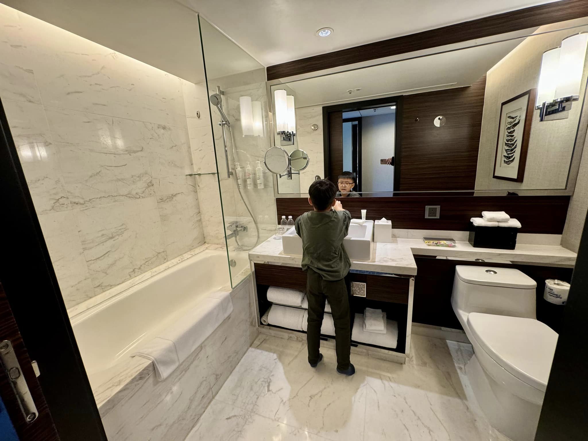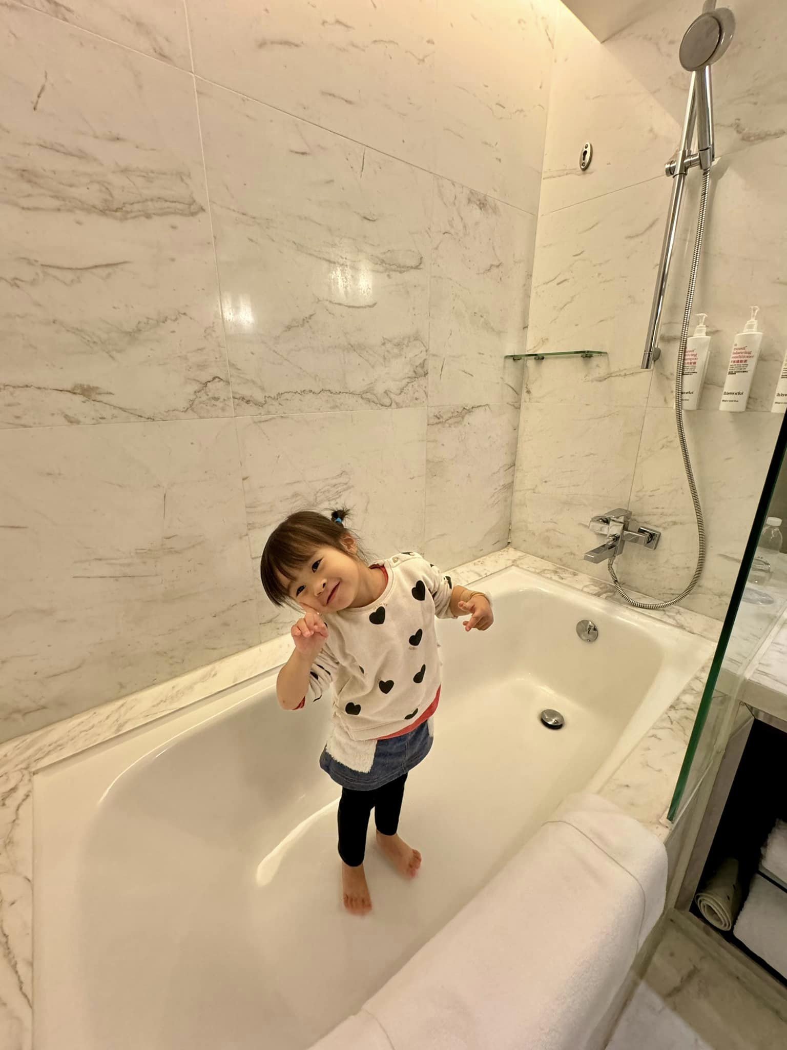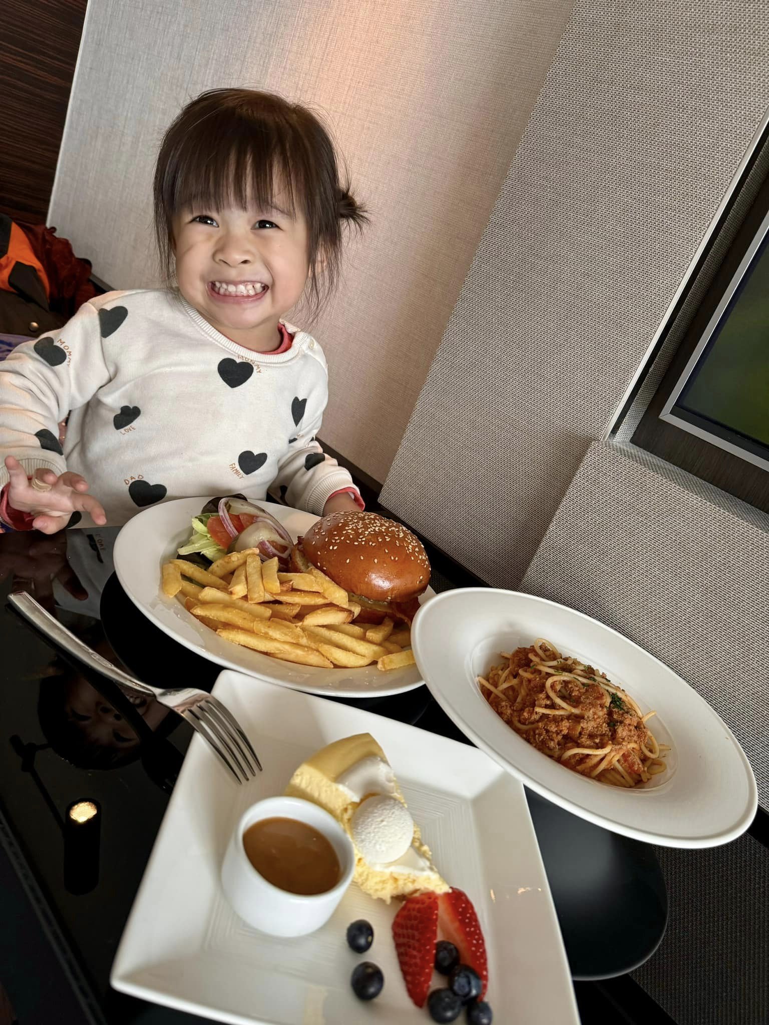 介紹一下間客房,媽媽大讚雙床房好闊落,雙人床夠大好好瞓!景觀可以望到飛機飛過,可以加BB床,有浴缸可以玩水,提供兒童牙刷、拖鞋等~套票包咗$500消費額,媽媽就用嚟叫咗Room Dining~肉醬意粉、漢堡薯條、芝士蛋糕 超快送餐10分鐘內就到,仲大大碟熱辣辣,好有水準!全部都好好食呀!