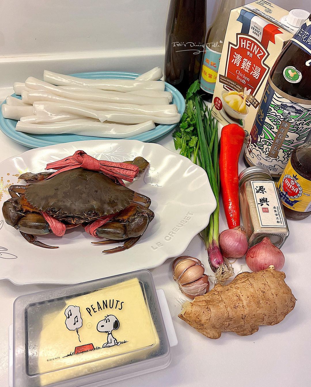 材料(2-3人份):膏蟹/肉蟹 1隻、白腸粉 6-8條切段、雞湯 200ml、薑 6片、紅蔥頭 2粒切件、蒜頭 6瓣、蔥 2棵、紹興花雕酒 1茶匙、生粉、芫茜/紅尖椒 (可省略)