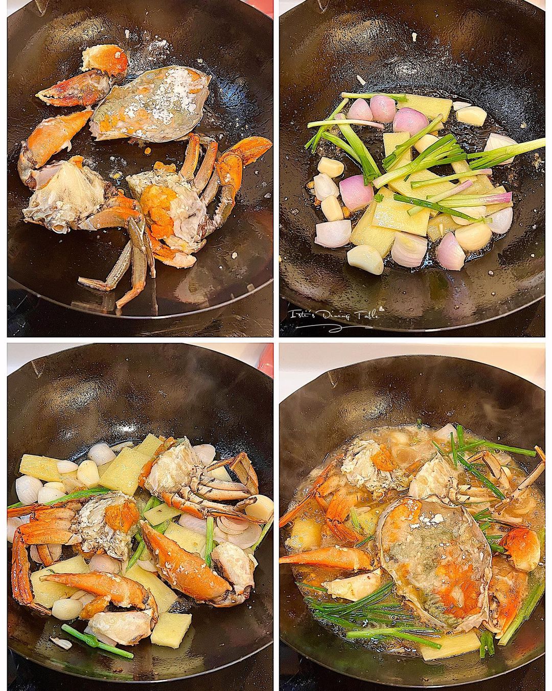 - 同一個鍋倒走多餘油份,放入薑片、蔥白、乾蔥和蒜粒,炒香後放入蟹件;灒入紹興花雕酒,倒入熱雞湯、調味料和蔥段,煮滾後合蓋煮約2分鐘,將蟹件翻面再煮2分鐘,如醬汁不夠濃稠可加生粉水。
