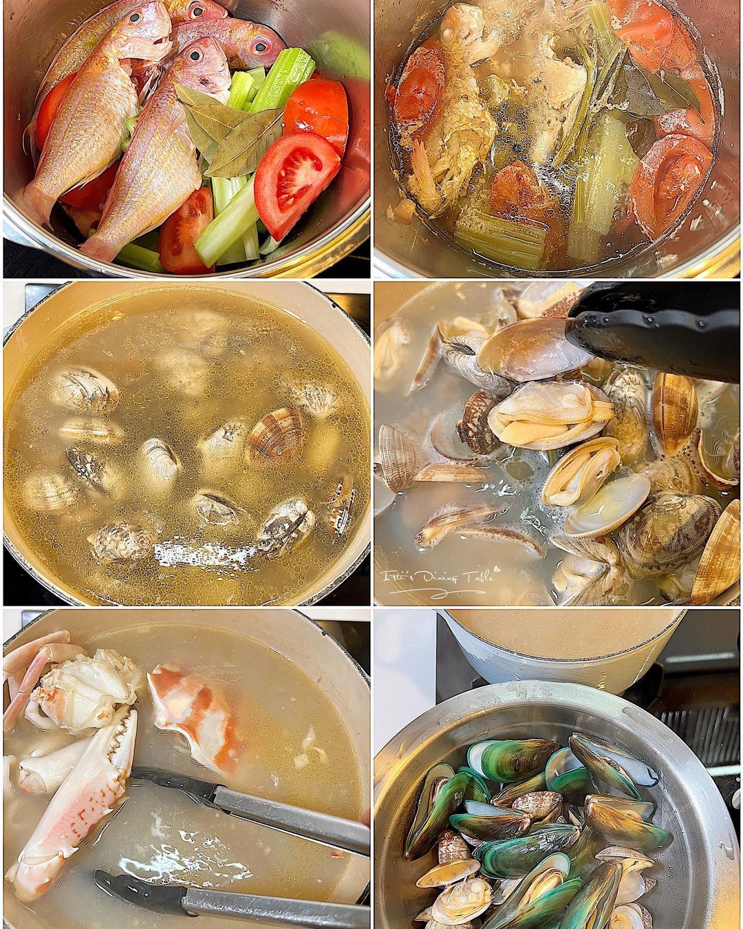 - 製作鮮魚高湯:除蕃茜葉外,所有材料放入大鍋煮沸,合蓋小火煮1小時(中途可搗爛魚肉)熄火,放入蕃茜葉合蓋焗5分鐘後取出,過篩;自選海鮮放入鮮魚高湯,煮熟後盛起。