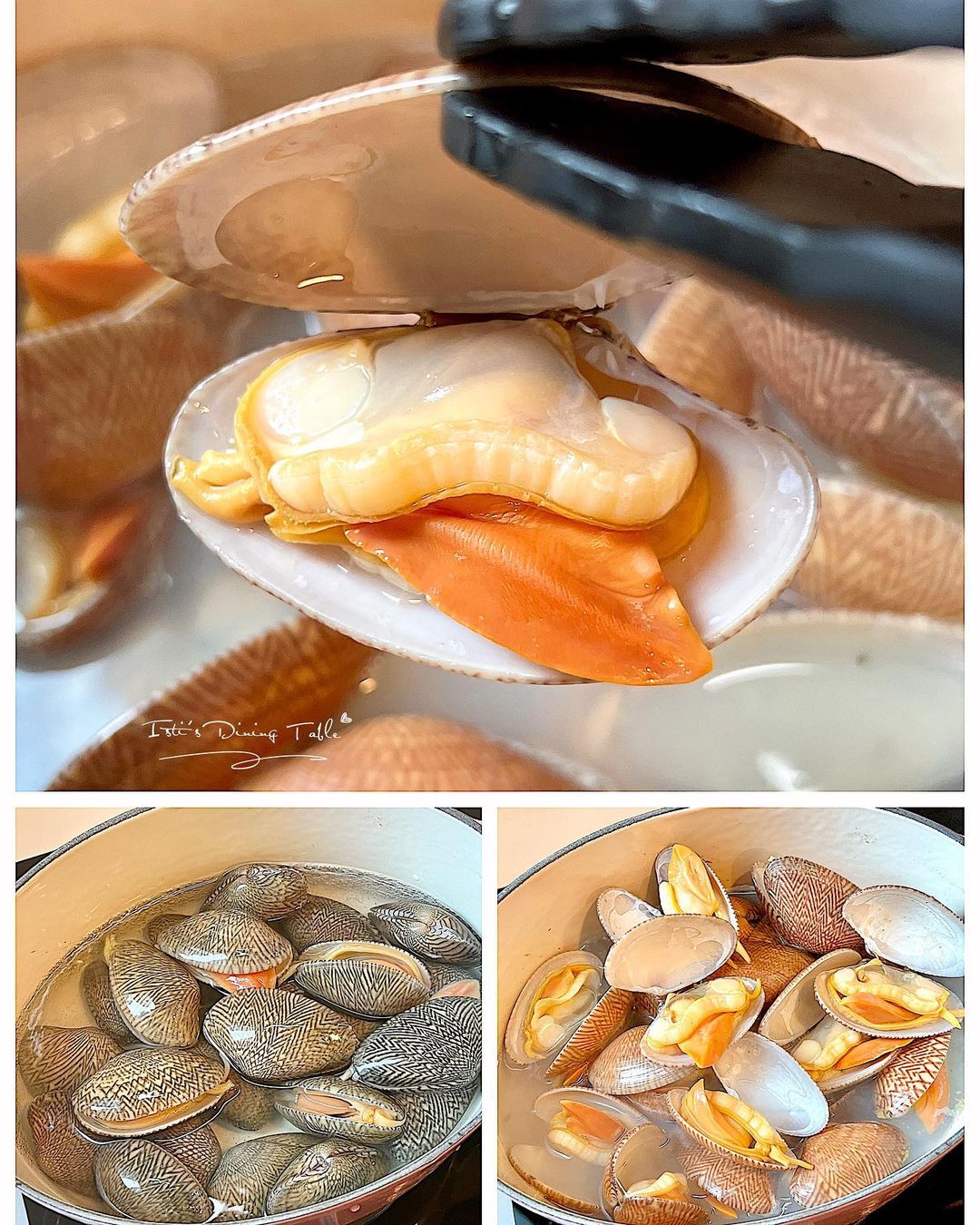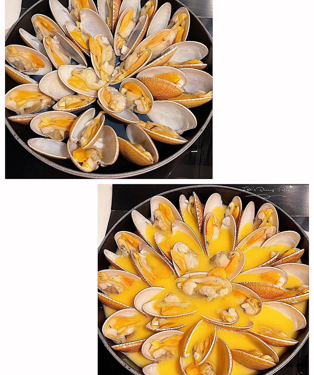 這食譜簡單又鮮甜好味,建議用菲律賓花甲王,蜆汁最鮮甜好味,蜆肉大粒又冇沙。另取出花甲水用來蒸蛋,將肉汁鮮味融入其中,提升菜式味道。順帶一提,擺盤可拆半殻或是全殻,並以梅花間竹排列,最後才倒入蛋汁。