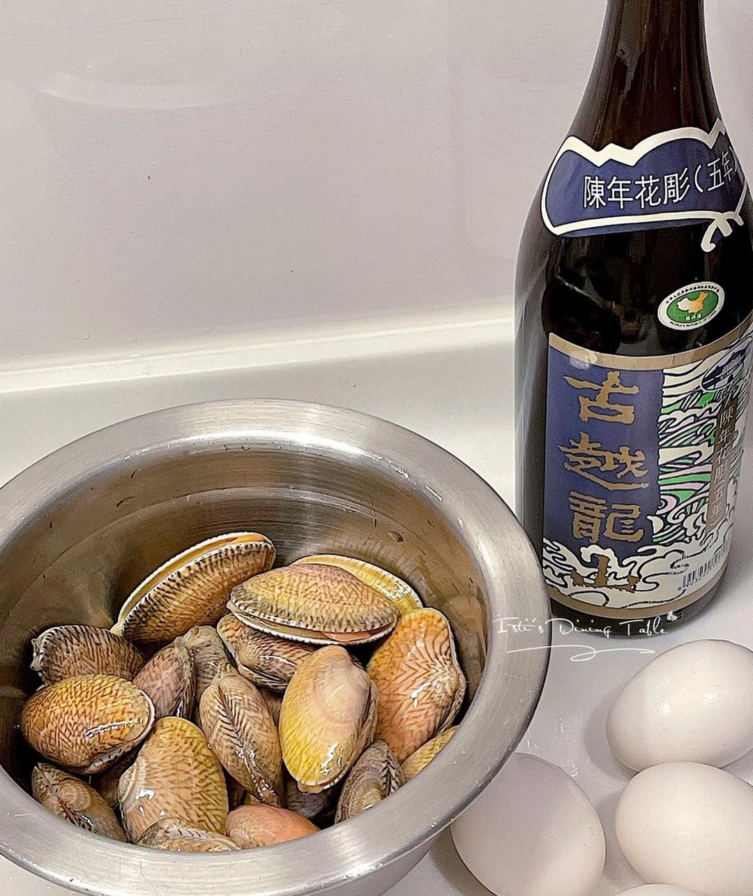 材料:花甲1.5斤、蛋 3隻、花甲水 300ml、紹興花雕酒2茶匙