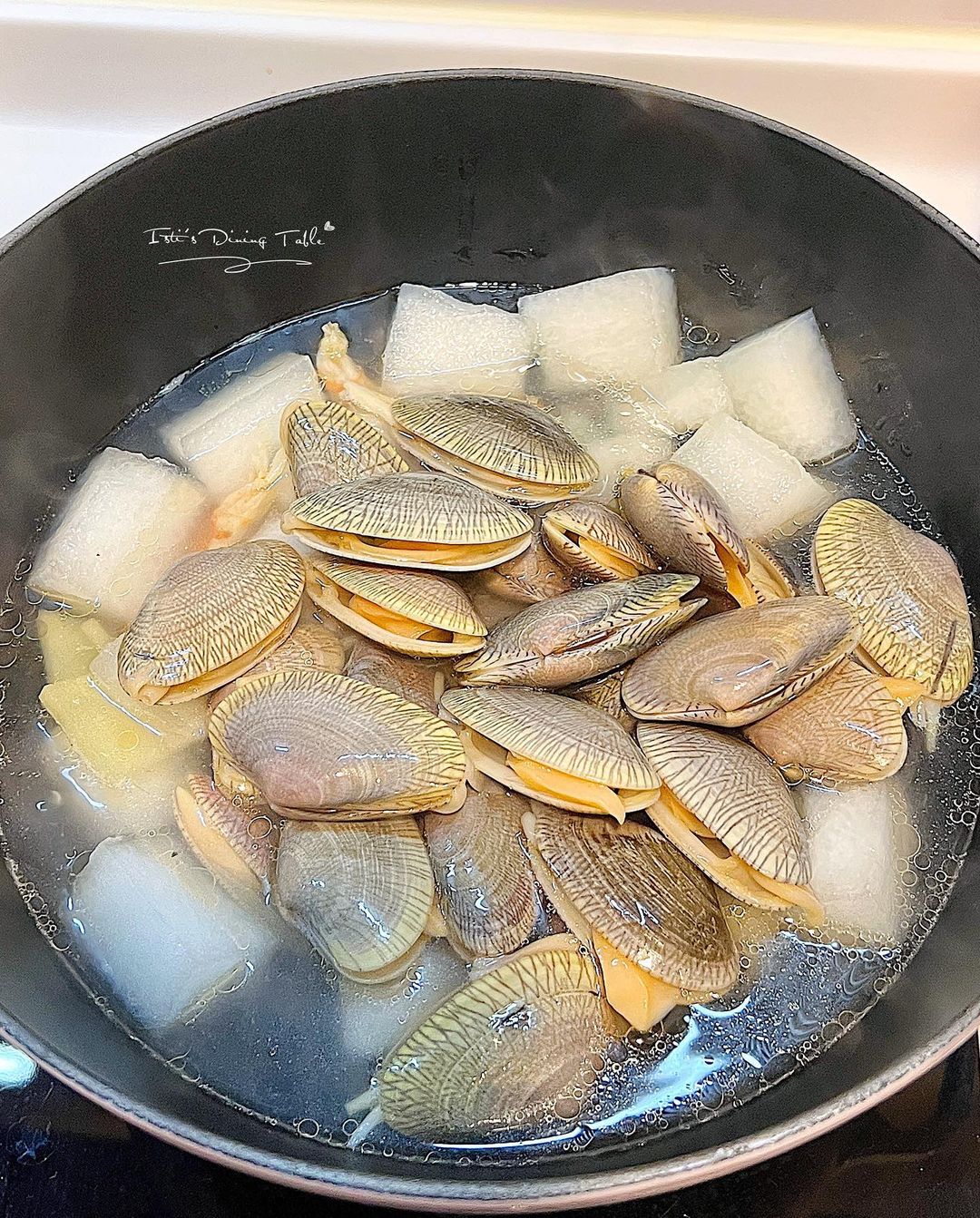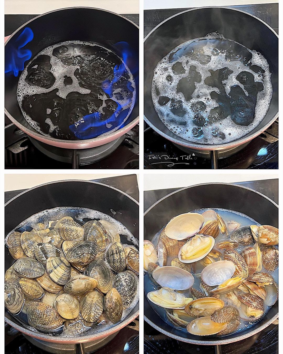 - 放入花甲,中火煮至開口後立即盛起避免過熟,灑上胡椒粉,試味