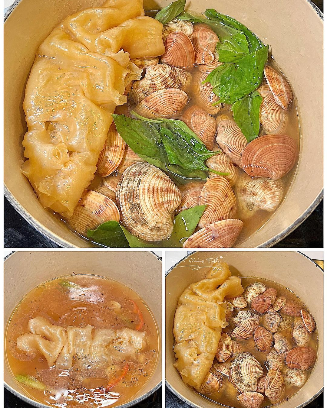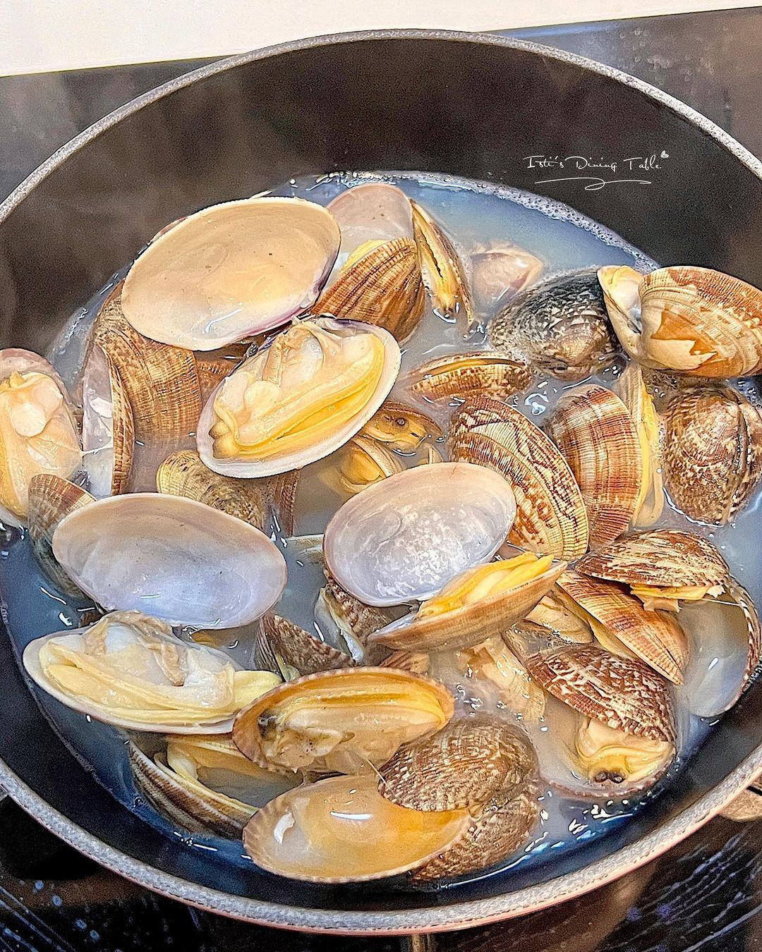 - 加入昆布高湯,煮滾後放入蜆,合蓋煮約4分鐘至開口。