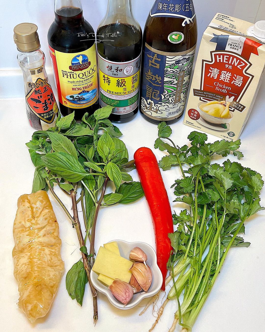 材料: 花甲1斤、已浸發花膠 1塊、薑 3片、蒜頭 4粒切片、芫荽根 3棵、雞湯 300ml、水 50ml、紹興花雕酒 25ml、九層塔 1棵、紅尖椒1條