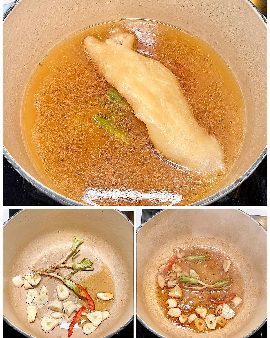 - 倒入雞湯和清水,加入調味料,煮沸後放入花膠,合蓋煮30分鐘,熄火加入九層塔。