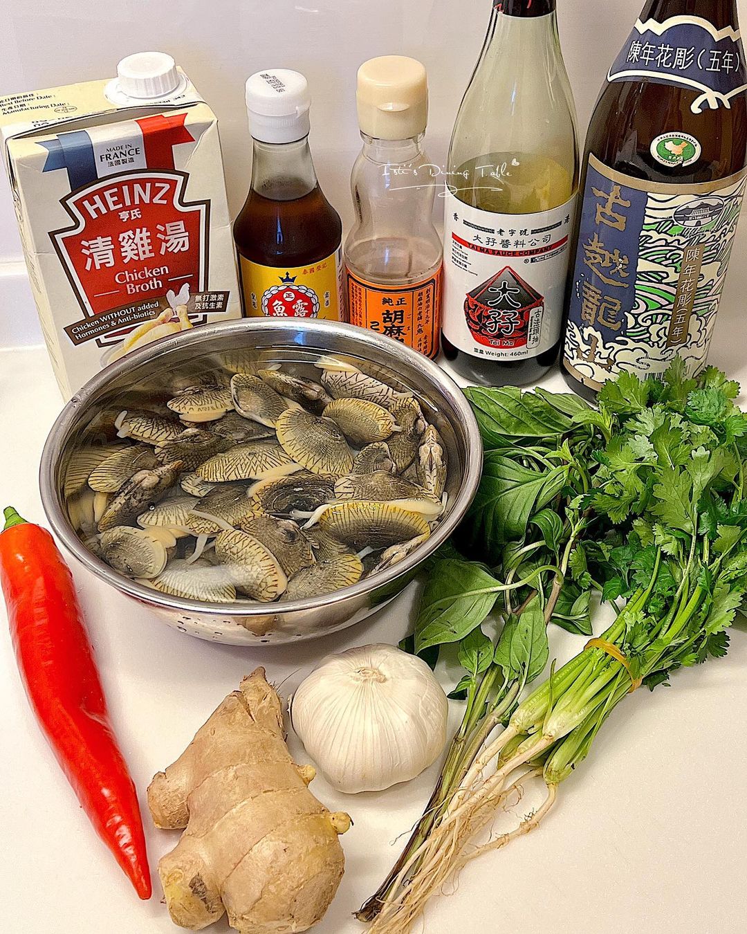 材料: 花甲1斤、薑3片、蒜頭 4粒切片、芫荽莖3棵、雞湯300ml、水50ml、紹興花雕酒25ml、九層塔1棵、紅尖椒1條