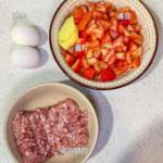 1. 蕃茄切小粒;豬肉與醃料拌勻,醃15分鐘;蛋發好。