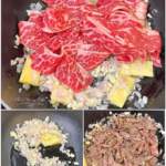 3. 下油開鍋,加入蒜粒、乾蔥碎和薑片炒香,下牛肉炒至半熟盛起。